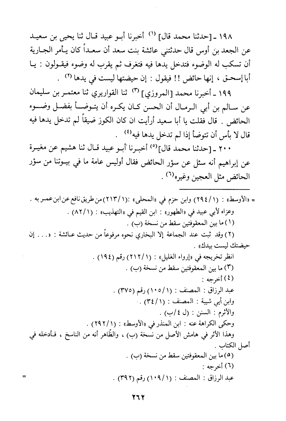 200 - حَدَّثَنَا مُحَمَّدٌ، قَالَ: أَخْبَرَنَا أَبُو عُبَيْدٍ ثنا هُشَيْمٌ، , عَنْ مُغِيرَةَ، عَنْ إِبْرَاهِيمَ، أَنَّهُ سُئِلَ عَنْ سُؤْرِ الْحَائِضِ، فَقَالَ «§أَوَلَيْسَ عَامَّةُ مَا فِي بُيُوتِنَا مِنْ سُؤْرِ الْحَائِضِ مِثْلُ الْعَجِينِ وَغَيْرِهِ» -[263]- قَالَ أَبُو عُبَيْدٍ: وَهَذَا قَوْلُ سُفْيَانَ وَعَلَيْهِ أَهْلُ الْعِرَاقِ مِنْ أَصْحَابِ الرَّأْيِ كُلُّهُمْ , وَلَا أَعْلَمُهُ إِلَّا قَوْلُ أَهْلِ الْحِجَازِ أَنَّهُ لَا بَأْسَ بِسُؤْرِهَا طَاهِرًا كَانَتْ أَمْ غَيْرَ طَاهِرٍ قَالَ أَبُو عُبَيْدٍ: وَهُوَ الْأَمْرُ الْمَعْمُولُ بِهِ عِنْدَنَا أَنَّهُ طَاهِرٌ , لِحَدِيثِ عَائِشَةَ الَّذِي ذَكَرْنَاهُ فِي هَذَا الْبَابِ , وَلِحَدِيثِ مَيْمُونَةَ فِي الْبَابِ الْأَوَّلِ مَعَ قَوْلِ ابْنِ عَبَّاسٍ , وَمَنْ وَافَقَهُ مَعَ هَذَا لَوْ أَنِّي أَصَبْتُ غَيْرَهُ كَانَ أَطْيَبُ لِنَفْسِي وَذَلِكَ عَلَى الِاخْتِيَارِ , وَلِمَا فِيهِ مِنَ الِاخْتِلَافِ , وَلَيْسَ عَلَى هَذَا إِفْسَادُ طَهُورِ أَحَدٍ بِذَلِكَ وَلَا صَلَاتِهِ