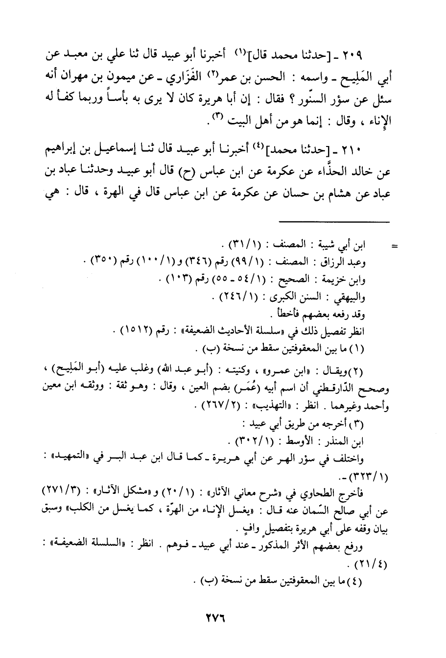 209 - حَدَّثَنَا مُحَمَّدٌ، قَالَ: أَخْبَرَنَا أَبُو عُبَيْدٍ قَالَ: ثنا عَلِيُّ بْنُ مَعْبَدٍ، عَنْ أَبِي الْمَلِيحِ وَاسْمُهُ الْحَسَنُ بْنُ عُمَرَ الْفَزَارِيُّ , عَنْ مَيْمُونِ بْنِ مِهْرَانَ، أَنَّهُ سُئِلَ عَنْ سُؤْرِ السِّنَّوْرِ،؟ فَقَالَ: إِنَّ أَبَا هُرَيْرَةَ، كَانَ لَا يَرَى بِهِ بَأْسًا وَرُبَّمَا كَفَأَ لَهُ الْإِنَاءَ , وَقَالَ: «§إِنَّمَا هُوَ مِنْ أَهْلِ الْبَيْتِ»