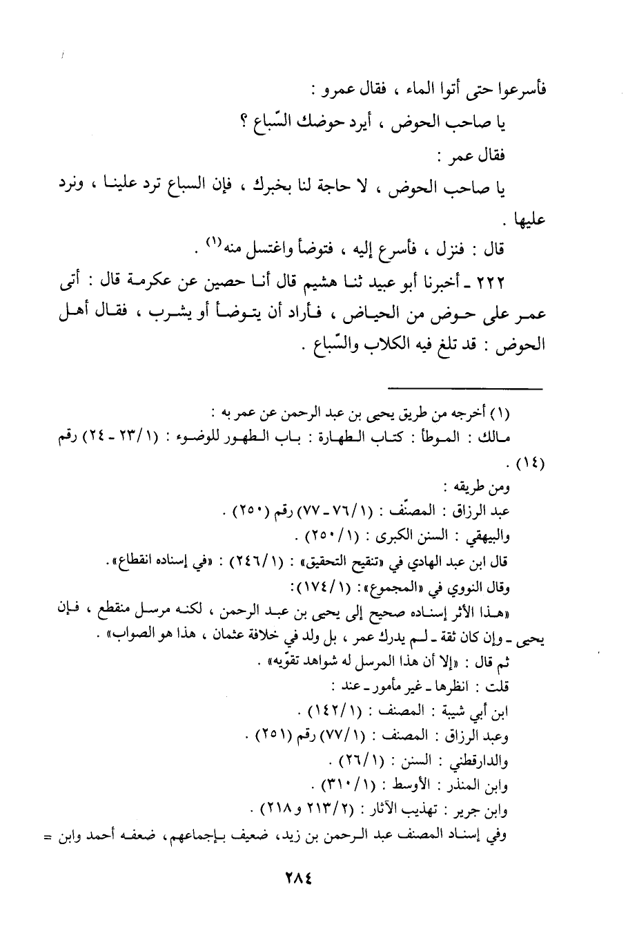 222 - أَخْبَرَنَا أَبُو عُبَيْدٍ ثنا هُشَيْمٌ، قَالَ: أنا حُصَيْنٌ، عَنْ عِكْرِمَةَ، قَالَ: أَتَى عُمَرُ عَلَى حَوْضٍ مِنَ الْحِيَاضِ , فَأَرَادَ أَنْ يَتَوَضَّأَ أَوْ يَشْرَبَ , فَقَالَ أَهْلُ الْحَوْضِ: قَدْ تَلِغُ فِيهِ الْكِلَابُ وَالسِّبَاعُ -[285]- فَقَالَ عُمَرُ: «إِنَّمَا §لَهَا مَا وَلَغَتْ فِي بُطُونِهَا , وَنَشْرَبُ وَنَتَوَضَّأُ»