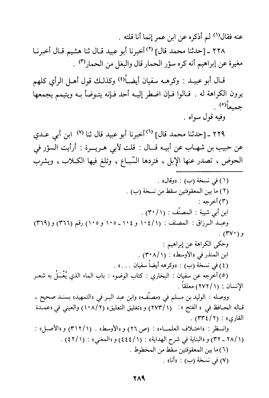 228 - حَدَّثَنَا مُحَمَّدٌ، قَالَ: أَخْبَرَنَا أَبُو عُبَيْدٍ قَالَ: ثنا هُشَيْمٌ، قَالَ: أَخْبَرَنَا مُغِيرَةُ، عَنْ إِبْرَاهِيمَ، أَنَّهُ " §كَرِهَ سُؤْرَ الْحِمَارِ , قَالَ: وَالْبَغْلُ مِنَ الْحِمَارِ " قَالَ أَبُو عُبَيْدٍ: وَكَرِهَهُ سُفْيَانُ أَيْضًا وَكَذَلِكَ قَوْلُ أَهْلِ الرَّأْيِ كُلُّهُمْ يَرَوْنَ الْكَرَاهَةَ لَهُ. قَالُوا: فَإِنِ اضْطُرَّ إِلَيْهِ أَحَدٌ فَإِنَّهُ يَتَوَضَّأُ بِهِ وَيَتَيَمَّمُ يَجْمَعُهَا جَمِيعًا. وَفِيهِ قَوْلٌ سِوَاهُ