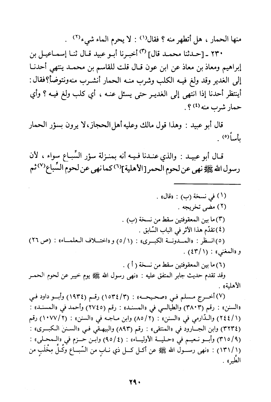 230 - حَدَّثَنَا مُحَمَّدٌ، قَالَ: أَخْبَرَنَا أَبُو عُبَيْدٍ قَالَ: ثنا إِسْمَاعِيلُ بْنُ إِبْرَاهِيمَ، وَمُعَاذٌ , عَنِ ابْنِ عَوْنٍ، قَالَ: قُلْتُ لِلْقَاسِمِ بْنِ مُحَمَّدٍ: يَنْتَهِي أَحَدُنَا إِلَى الْغَدِيرِ وَقَدْ وَلَغَ فِيهِ الْكَلْبُ وَشَرِبَ مِنْهُ الْحِمَارُ أَنَشْرَبُ مِنْهُ وَنَتَوَضَّأُ؟ فَقَالَ: «§أَيَنْتَظِرُ أَحَدُنَا إِذَا انْتَهَى إِلَى الْغَدِيرِ حَتَّى يَسْأَلَ عَنْهُ , أَيُّ كَلْبٍ وَلَغَ فِيهِ؟ وَأَيُّ حِمَارٍ شَرِبَ مِنْهُ؟» قَالَ أَبُو عُبَيْدٍ: وَهَذَا قَوْلُ مَالِكٍ وَعَلَيْهِ أَهْلُ الْحِجَازِ , لَا يَرَوْنَ بِسُؤْرِ الْحِمَارِ , بَأْسًا قَالَ أَبُو عُبَيْدٍ: وَالَّذِي عِنْدَنَا فِيهِ أَنَّهُ بِمَنْزِلَةِ سُؤْرِ السِّبَاعِ سَوَاءٌ , لِأَنَّ رَسُولَ اللَّهِ صَلَّى اللَّهُ عَلَيْهِ وَسَلَّمَ نَهَى عَنْ لُحُومِ الْحُمُرِ الْأَهْلِيَّةِ كَمَا نَهَى عَنْ لُحُومِ السِّبَاعِ ثُمَّ -[291]- لَمْ تَأْتِنَا عَنْهُ سُنَّةٌ فِي آسَارِ هَذِهِ , كَمَا لَمْ تَأْتِنَا عَنْهُ سُنَّةٌ فِي تِلْكَ إِنَّمَا تَكَلَّمَتِ الْعُلَمَاءُ فِيهَا بَعْدَهُ , عَلَيْهِ السَّلَامُ , بِالسَّعَةِ وَالْكَرَاهَةِ. فَالْقَوْلُ عِنْدَنَا فِيهِمَا قَوْلٌ وَاحِدٌ , أَنَّا لَا نُحِبُّ لِأَحَدٍ أَنْ يَتَوَضَّأَ مِنْهَا بِشَيْءٍ وَهُوَ يَجِدُ غَيْرَهُ , فَإِنِ اضْطُرَّ إِلَيْهِمَا وَلَمْ يَجِدْ سِوَاهُمَا كَانَ الْوُضُوءُ بِهِمَا مُجْزِيًا , وَالصَّلَاةُ تَامَّةً , وَلَا أَرَى أَنْ يُضَمَّ إِلَيْهِ التَّيَمُّمُ , لِأَنَّهُ إِنْ كَانَ ذَلِكَ الْمَاءُ طَاهِرًا فَلَا مَوْضِعَ لِلتَّيَمُّمِ هُنَاكَ , فَإِنْ كَانَ غَيْرَ طَاهِرٍ فَقَدْ أَنْجَسَ الْمُتَوَضِّئَ بِهِ , وَإِنَّ التَّيَمُّمَ لَا يُزِيلُ النَّجَاسَةَ وَلَا يُطَهِّرُهَا , إِنَّمَا التَّيَمُّمُ بَدَلٌ مِنَ الطَّهُورِ فِي الْحَدَثِ فَقَطْ , وَمَعَ هَذَا إِنَّا لَا نَجِدُ طَهُورَيْنِ يَجْتَمِعَانِ عَلَى مُسْلِمٍ فِي كِتَابٍ وَلَا سُنَّةٍ. فَإِنْ قَالَ قَائِلٌ: إِنَّ التَّيَمُّمَ لَمْ يُؤْمَرْ بِهِ مَعَ الْوُضُوءِ لِلنَّجَاسَةِ , إِنَّمَا هُوَ الِاحْتِيَاطُ فِي الْوُضُوءِ , وَالْأَخْذُ بِالثِّقَةِ , قِيلَ لَهُ: فَإِنَّ الْأَخْذَ بِالثِّقَةِ أَنْ لَا يَمَسَّ مَاءً , إِلَّا وَهُوَ عِنْدَهُ طَاهِرٌ , فَكَانَ يَلْزَمُ صَاحِبَ هَذَا الْقَوْلِ أَنْ يَأْمُرَهُ بِالتَّيَمُّمِ , وَتَرْكِ سُؤْرِ الْحِمَارِ , فَأَيُّ قَوْلٍ أَفْحَشُ مِنْ هَذَا قَالَ أَبُو عُبَيْدٍ قَدْ ذَكَرْنَا مَا فِي سُؤْرِ الْحِمَارِ وَكَذَلِكَ نَقُولُ فِي الْبِغَالِ مِثْلَهُ. فَأَمَّا الْخَيْلُ فَإِنَّ الْأَمْرَ فِيهَا أَسْهَلُ , لِأَنَّ أَهْلَ الْعِرَاقِ عَلَى الرُّخْصَةِ فِي أَكَلِ لُحُومِهَا , وَلَمْ تَأْتِ الْآثَارُ بِمِثْلِ مَا جَاءَتْ فِي الْحُمُرِ مِنَ النَّهْيِ بِمِثْلِ مَا -[292]- جَاءَتْ فِي بَعْضِهَا بِالرُّخْصَةِ. وَأَمَّا كُلُّ مَا يُؤْكَلُ مِنَ الْأَرْوَاحِ الثَّمَانِيَةِ فَلَا أَعْلَمُ أَحَدًا كَرِهَ شَيْئًا مِنْ سُؤْرِهَا , وَكَذَلِكَ كُلُّ مَا يُؤْكَلُ لَحْمُهُ مِنَ الطَّيْرِ مَا خَلَا الدَّجَاجَ فَإِنَّهَا رُبَّمَا أَكَلَتِ الْأَقْذَارَ. وَقَدْ حُكِيَ عَنْ بَعْضِ الْعُلَمَاءِ كَرَاهَتُهُ , وَالدَّلِيلُ عَلَى ذَلِكَ مَا رُوِيَ عَنِ ابْنِ عُمَرَ فِي رَبْطِهَا ثَلَاثَةَ أَيَّامٍ عِنْدَ ذَبْحِهَا , وَكَذَلكَ كُلُّ مَا أَكَلَ الْجِيَفَ مِنَ الطَّيْرِ , مِثْلُ النُّسُورِ وَالْحِدَاءِ وَالرَّخَمِ فَكُلُّ أَسَآرِهَا مَكْرُوهٌ , وَلَا يُتَوَضَّأُ مِنْهُ إِلَّا فِي الِاضْطِرَارِ وَالْحَاجَةِ إِلَيْهِ