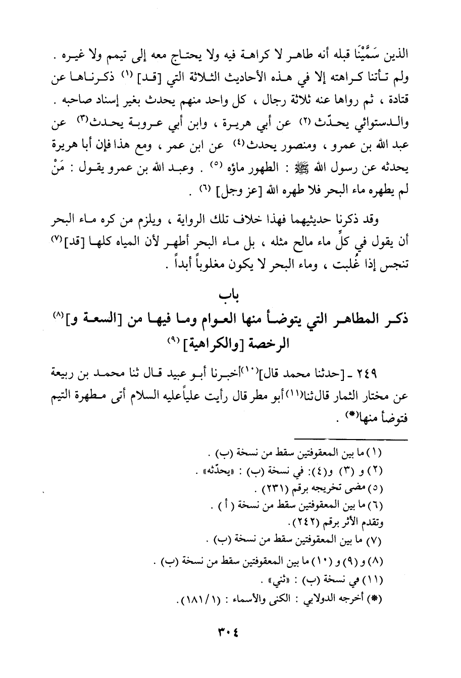 249 - حَدَّثَنَا مُحَمَّدٌ، قَالَ: أَخْبَرَنَا أَبُو عُبَيْدٍ قَالَ: ثنا مُحَمَّدُ بْنُ رَبِيعَةَ، عَنْ مُخْتَارٍ التَّمَّارِ، قَالَ: ثنا أَبُو مَطَرٍ، قَالَ: رَأَيْتُ عَلِيًّا عَلَيْهِ السَّلَامُ «§أَتَى مَطْهَرَةَ التَّيْمِ فَتَوَضَّأَ مِنْهَا»