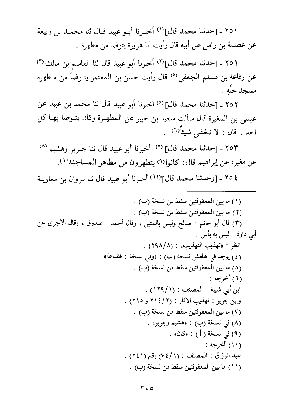 253 - حَدَّثَنَا مُحَمَّدٌ، قَالَ: أَخْبَرَنَا أَبُو عُبَيْدٍ قَالَ: ثنا جَرِيرٌ، وَهُشَيْمٌ، عَنْ مُغِيرَةَ، عَنْ إِبْرَاهِيمَ، قَالَ: «§كَانُوا يَتَطَهَّرُونَ مِنْ مَطَاهِرِ الْمَسَاجِدِ»