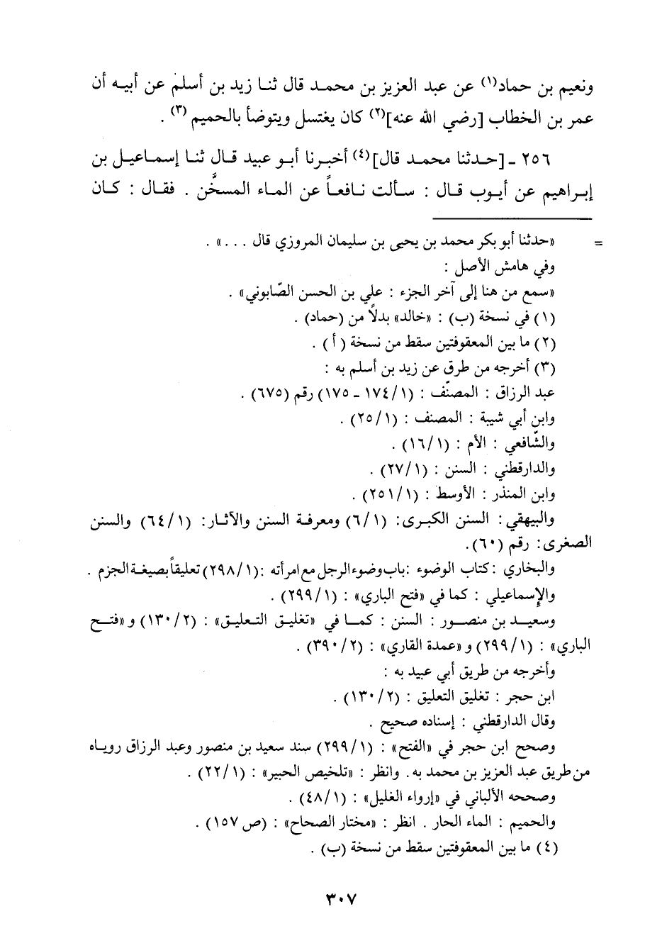256 - حَدَّثَنَا مُحَمَّدٌ، قَالَ: أَخْبَرَنَا أَبُو عُبَيْدٍ قَالَ: ثنا إِسْمَاعِيلُ بْنُ إِبْرَاهِيمَ، عَنْ أَيُّوبَ، قَالَ: سَأَلْتُ نَافِعًا عَنِ الْمَاءِ الْمُسَخَّنِ، فَقَالَ: «كَانَ -[308]- عَبْدُ اللَّهِ بْنُ عُمَرَ §يَتَوَضَّأُ بِالْحَمِيمِ»