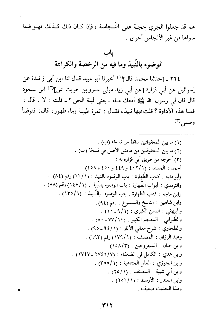 264 - حَدَّثَنَا مُحَمَّدٌ، قَالَ: أَخْبَرَنَا أَبُو عُبَيْدٍ قَالَ: ثنا ابْنُ أَبِي زَائِدَةَ، عَنْ إِسْرَائِيلَ، عَنْ أَبِي فَزَارَةَ، عَنْ أَبِي زَيْدٍ، مَوْلَى عَمْرِو بْنِ حُرَيْثٍ , عَنِ ابْنِ مَسْعُودٍ، قَالَ: قَالَ لِي رَسُولُ اللَّهِ صَلَّى اللَّهُ عَلَيْهِ وَسَلَّمَ: «§أَمَعَكَ مَاءٌ - يَعْنِي لَيْلَةَ الْجِنِّ -؟» قُلْتُ: لَا , قَالَ: «فَمَا هَذِهِ الْإِدَاوَةُ؟» , قُلْتُ: فِيهَا نَبِيذٌ , فَقَالَ: تَمْرَةٌ طَيِّبَةٌ وَمَاءٌ طَهُورٌ , قَالَ: «فَتَوَضَّأَ وَصَلَّى»
