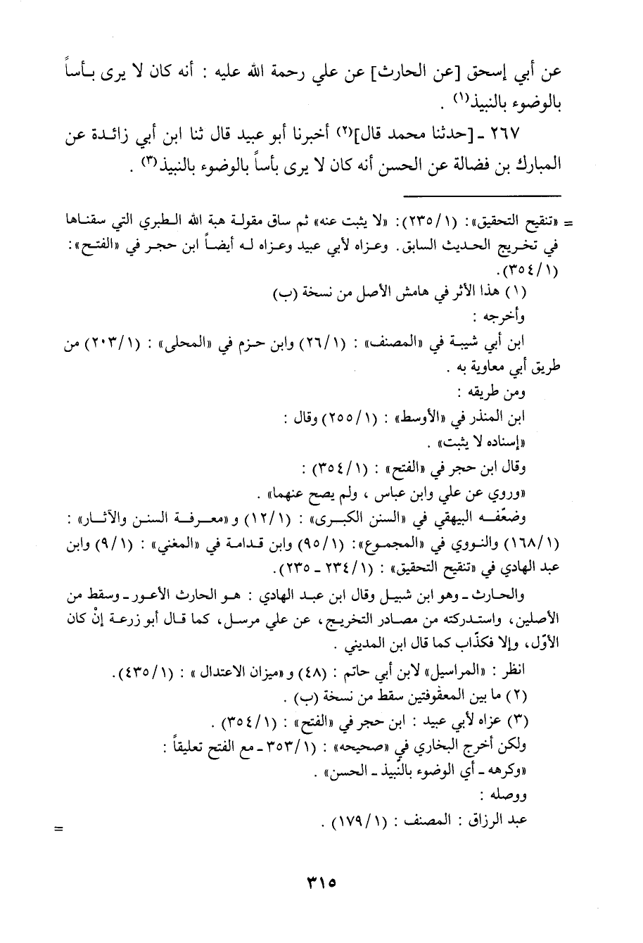 267 - حَدَّثَنَا مُحَمَّدٌ، قَالَ: أَخْبَرَنَا أَبُو عُبَيْدٍ قَالَ: ثنا ابْنُ أَبِي زَائِدَةَ، عَنِ الْمُبَارَكِ بْنِ فَضَالَةَ، عَنِ الْحَسَنِ، أَنَّهُ «§كَانَ لَا يَرَى بَأْسًا بِالْوُضُوءِ بِالنَّبِيذِ» -[316]- قَالَ أَبُو عُبَيْدٍ: وَاخْتَلَفَ أَهْلُ الْعِرَاقِ مِنْ أَصْحَابِ الرَّأْيِ فِي هَذَا فَلَهُمْ فِيهِ ثَلَاثَةُ أَقْوَالٍ: فَأَحَدُهَا: أَنَّهُ يُجْزِئُهُ أَنْ يَتَوَضَّأَ بِهِ , وَلَا يَحْتَاجُ مَعَهُ إِلَى تَيَمُّمٍ. وَالثَّانِي: أَنَّهُ يَتَيَمَّمُ وَلَا يَتَوَضَّأُ بِهِ. وَالثَّالِثُ: أَنَّهُ يَجْمَعُ الْوُضُوءَ بِهِ وَالتَّيَمُّمَ. وَكُلُّ هَذَا عِنْدَهُمْ إِنَّمَا هُوَ فِي نَبِيذِ التَّمْرِ خَاصَّةً , فَأَمَّا الزَّبِيبُ فَلَا أَعْلَمُ أَحَدًا مِنْهُمْ يَرَى الْوُضُوءَ بِهِ قَالَ أَبُو عُبَيْدٍ: وَقَدْ رُوِيَ عَنْ مَالِكِ بْنِ أَنَسٍ أَنَّهُ كَانَ لَا يَرَى الْوُضُوءَ بِشَيْءٍ مِنْ أَنْوَاعِ النَّبِيذِ مِنْ تَمْرٍ وَلَا زَبِيبٍ وَلَا غَيْرِهِ -[317]- قَالَ أَبُو عُبَيْدٍ: وَإِنَّ الَّذِي عِنْدَنَا فِي النَّبِيذِ هَذَا الْقَوْلُ: أَنَّهُ لَا يُتَوَضَّأُ بِهِ , وَلَا يَكُونُ طَهُورًا أَبَدًا , لِأَنَّ اللَّهَ جَلَّ وَعَزَّ , اشْتَرَطَ لِلطَّهُورِ شَرْطَيْنِ ثُمَّ لَمْ يَجْعَلْ لَهُمَا ثَالِثًا. وَهُمَا: الْمَاءُ وَالصَّعِيدُ , وَأَنَّ النَّبِيذَ لَيْسَ بِوَاحِدٍ مِنْ هَذَيْنِ. وَأَمَّا الَّذِي رُوِيَ عَنِ ابْنِ مَسْعُودٍ فِي لَيْلَةِ الْجِنِّ فَإِنَّا لَا نُثْبِتُهُ مِنْ أَجْلِ أَنَّ الْإِسْنَادَ فِيهِ لَيْسَ بِمَعْرُوفٍ. وَقَدْ وَجَدْنَا مَعَ هَذَا أَهْلَ الْخِبْرَةِ وَالْمَعْرِفَةِ بِابْنِ مَسْعُودٍ يُنْكِرُونَ أَنْ يَكُونَ حَضَرَ فِي تِلْكَ اللَّيْلَةِ مَعَ النَّبِيِّ صَلَّى اللَّهُ عَلَيْهِ وَسَلَّمَ , مِنْهُمُ: ابْنُهُ أَبُو عُبَيْدَةَ بْنُ عَبْدِ اللَّهِ , وَصَاحِبُهُ عَلْقَمَةُ بْنُ قَيْسٍ , مَعَ هَذَا كُلِّهِ أَنَّهُ لَوْ -[318]- كَانَ لَهُ أَصْلٌ لَكَانَ مَنْسُوخًا , لِأَنَّ لَيْلَةَ الْجِنِّ كَانَتْ بِمَكَّةَ فِي صَدْرِ الْإِسْلَامِ قَبْلَ الْهِجْرَةِ بِدَهْرٍ , وَقَدْ كَانَتْ رُخْصَةُ السُّكْرِ وَهُوَ مِنَ التَّمْرِ , فَنَزَلَتْ فِي سُورَةِ النَّحْلِ , وَالنَّحْلُ مَكِّيَّةٌ , فَلَعَلَّ الْوُضُوءَ كَانَ يَوْمَئِذٍ ثُمَّ أَنْزَلَ اللَّهُ تَحْرِيمَ الْخَمْرِ فِي الْمَائِدَةِ , وَهِيَ مَدَنِيَّةٌ , فَكَانَ تَحْرِيمُهَا فِي قَوْلِ الْعُلَمَاءِ نَاسِخًا لِلسُّكْرِ وَهُوَ مِنَ التَّمْرِ , فَكَيْفَ يُتَوَضَّأُ بِشَيْءٍ قَدْ نُسِخَ شُرْبُهُ بِالتَّحْرِيمِ