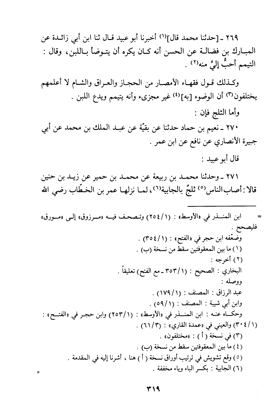 269 - حَدَّثَنَا مُحَمَّدٌ، قَالَ: أَخْبَرَنَا أَبُو عُبَيْدٍ قَالَ: ثنا ابْنُ أَبِي زَائِدَةَ، عَنِ الْمُبَارَكِ بْنِ فَضَالَةَ، عَنِ الْحَسَنِ، أَنَّهُ كَانَ يَكْرَهُ أَنْ يُتَوَضَّأَ بِاللَّبَنِ , وَقَالَ: «§التَّيَمُّمُ أَحَبُّ إِلَيَّ مِنْهُ» وَكَذَلِكَ قَوْلُ فُقَهَاءِ الْأَمْصَارِ مِنَ الْحِجَازِ وَالْعِرَاقِ وَالشَّامِ , لَا أَعْلَمُهُمْ يَخْتَلِفُونَ , أَنَّ الْوُضُوءَ بِهِ غَيْرُ مُجْزِئٍ , وَأَنَّهُ يَتَيَمَّمُ وَيَدَعُ اللَّبَنَ، وَأَمَّا الثَّلْجُ