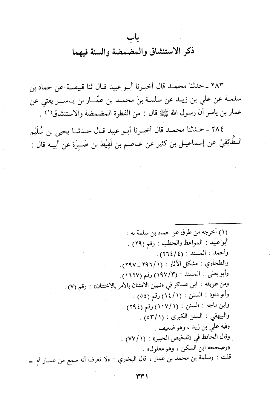 283 - حَدَّثَنَا مُحَمَّدٌ، قَالَ: أَخْبَرَنَا أَبُو عُبَيْدٍ قَالَ: ثنا قَبِيصَةُ، عَنْ حَمَّادِ بْنِ سَلَمَةَ، عَنْ عَلِيِّ بْنِ زَيْدٍ، عَنْ سَلَمَةَ بْنِ مُحَمَّدِ بْنِ عَمَّارِ بْنِ يَاسِرٍ، يُفْتِي عَنْ عَمَّارِ بْنِ يَاسِرٍ، أَنَّ رَسُولَ اللَّهِ صَلَّى اللَّهُ عَلَيْهِ وَسَلَّمَ قَالَ: «§مِنَ الْفِطْرَةِ الْمَضْمَضَةُ وَالِاسْتِنْشَاقُ»