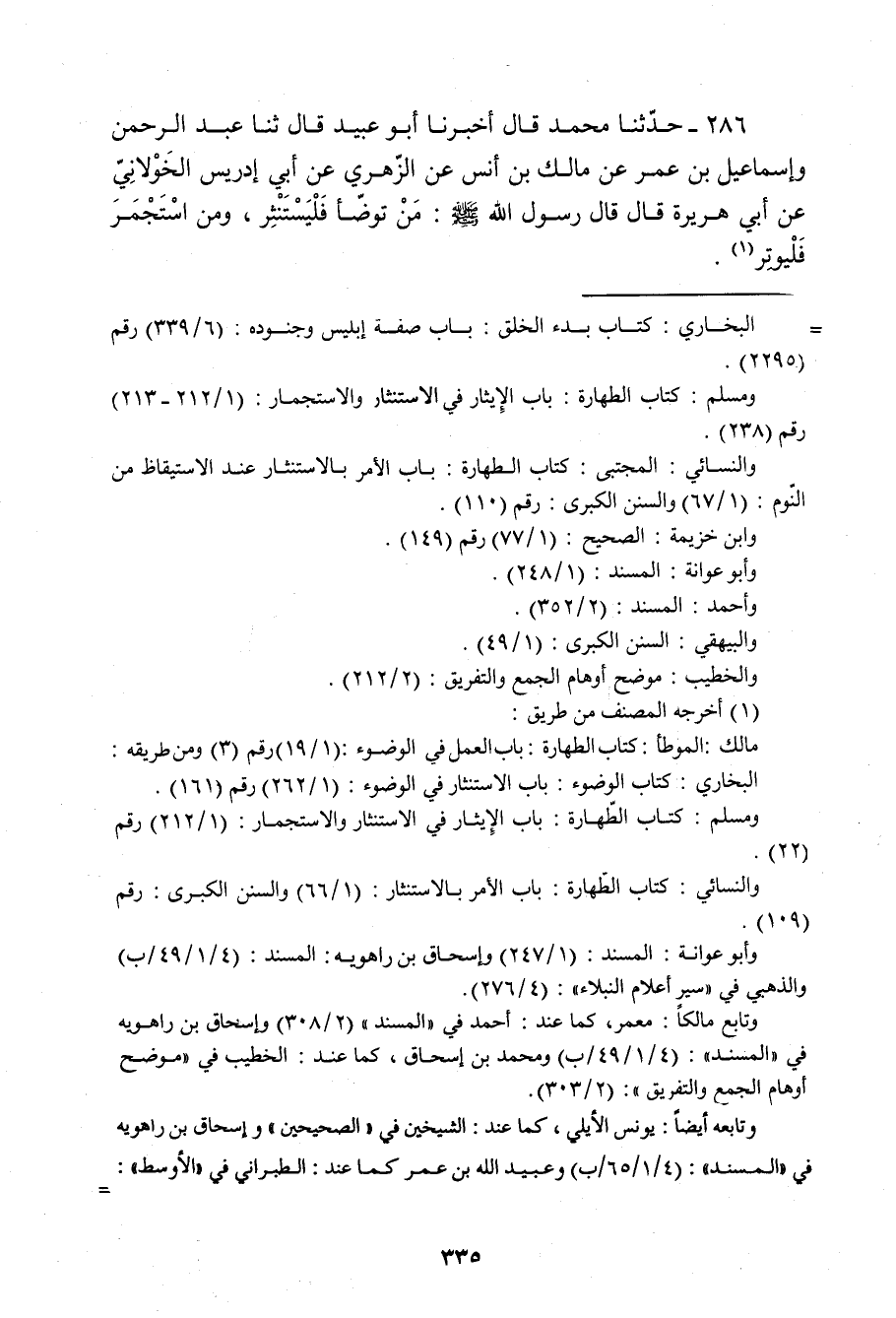 286 - حَدَّثَنَا مُحَمَّدٌ، قَالَ: أَخْبَرَنَا أَبُو عُبَيْدٍ قَالَ: ثنا عَبْدُ الرَّحْمَنِ، وَإِسْمَاعِيلُ بْنُ عُمَرَ، عَنْ مَالِكِ بْنِ أَنَسٍ، عَنِ الزُّهْرِيِّ، عَنْ أَبِي إِدْرِيسَ الْخَوْلَانِيِّ، عَنْ أَبِي هُرَيْرَةَ، قَالَ: قَالَ رَسُولُ اللَّهِ صَلَّى اللَّهُ عَلَيْهِ وَسَلَّمَ: «§مَنْ تَوَضَّأَ فَلْيَسْتَنْثِرْ , وَمَنِ اسْتَجْمَرَ فَلْيُوتِرْ»