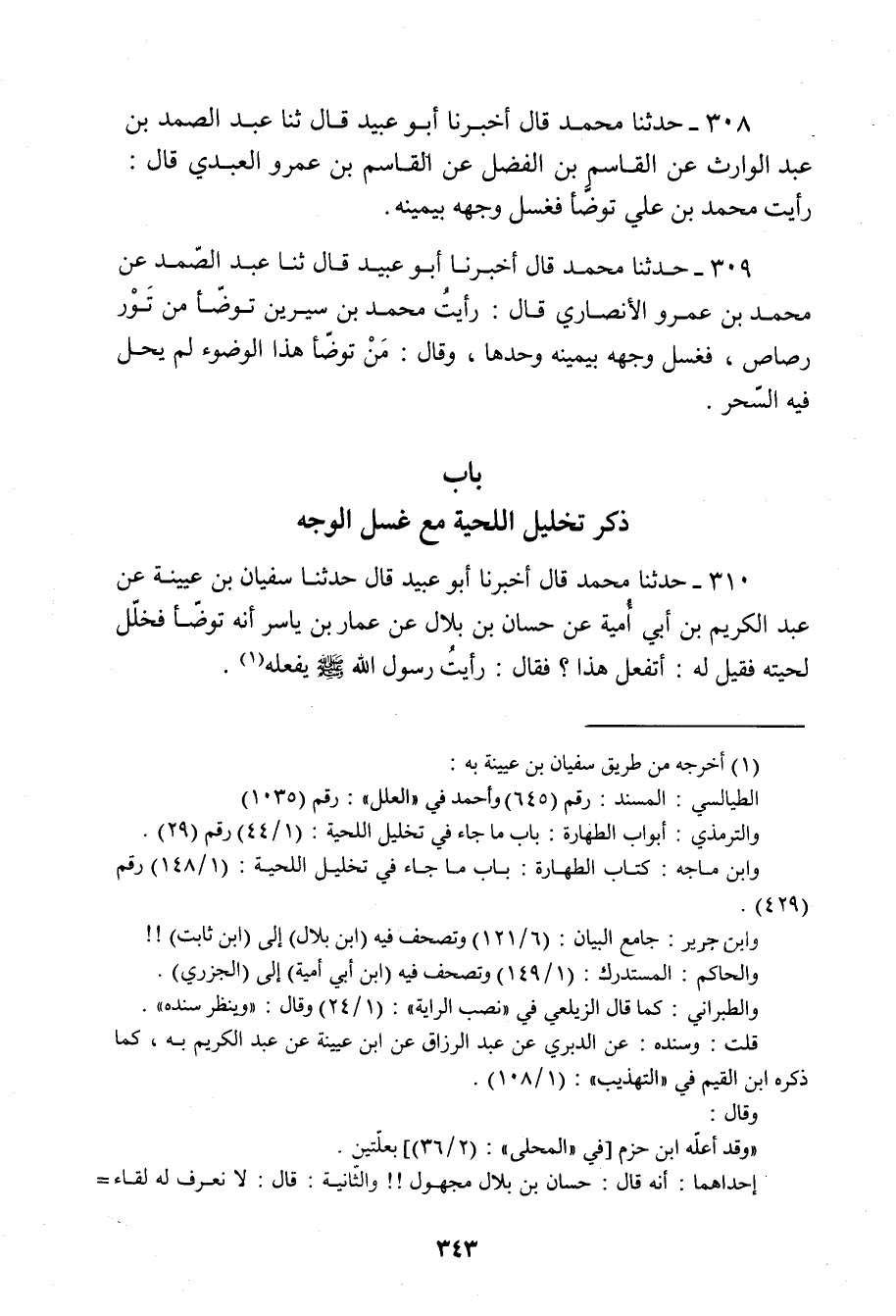 310 - حَدَّثَنَا مُحَمَّدٌ، قَالَ: أَخْبَرَنَا أَبُو عُبَيْدٍ قَالَ: حَدَّثَنَا سُفْيَانُ بْنُ عُيَيْنَةَ، عَنْ عَبْدِ الْكَرِيمِ بْنِ أَبِي أُمَيَّةَ، عَنْ حَسَّانَ بْنِ بِلَالٍ، عَنْ عَمَّارِ بْنِ يَاسِرٍ، أَنَّهُ " §تَوَضَّأَ فَخَلَّلَ لِحْيَتَهُ فَقِيلَ لَهُ: أَتَفْعَلُ هَذَا؟ فَقَالَ: رَأَيْتُ رَسُولَ اللَّهِ صَلَّى اللَّهُ عَلَيْهِ وَسَلَّمَ يَفْعَلُهُ "