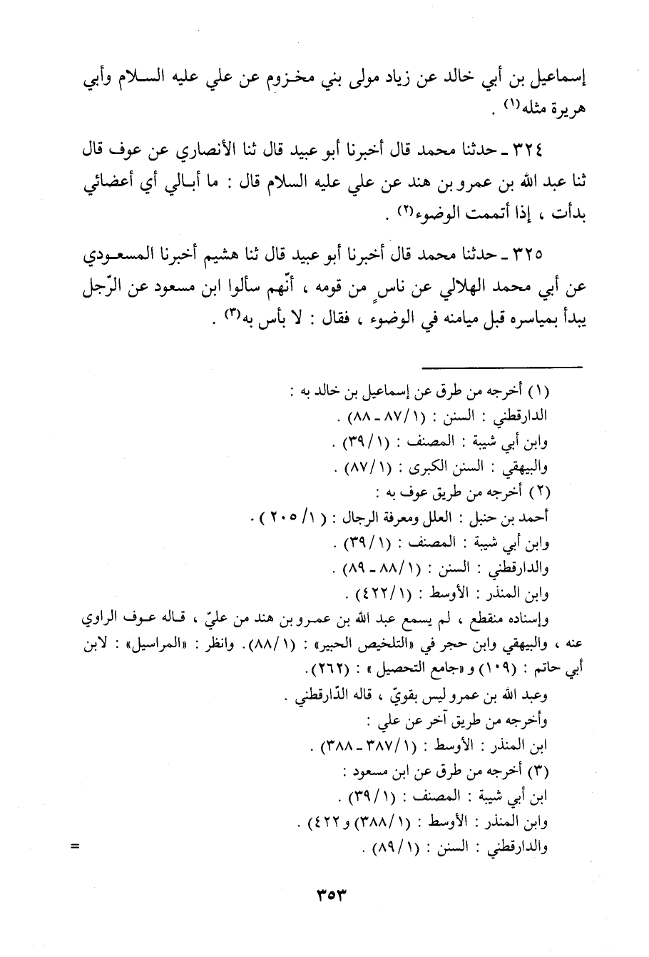 324 - حَدَّثَنَا مُحَمَّدٌ، قَالَ: أَخْبَرَنَا أَبُو عُبَيْدٍ قَالَ: ثنا الْأَنْصَارِيُّ، عَنْ عَوْفٍ قَالَ: ثنا عَبْدُ اللَّهِ بْنُ عَمْرِو بْنِ هِنْدٍ، عَنْ عَلِيٍّ عَلَيْهِ السَّلَامُ قَالَ: «§مَا أُبَالِي أَيَّ أَعْضَائِي بَدَأْتُ , إِذَا أَتْمَمْتُ الْوُضُوءَ»