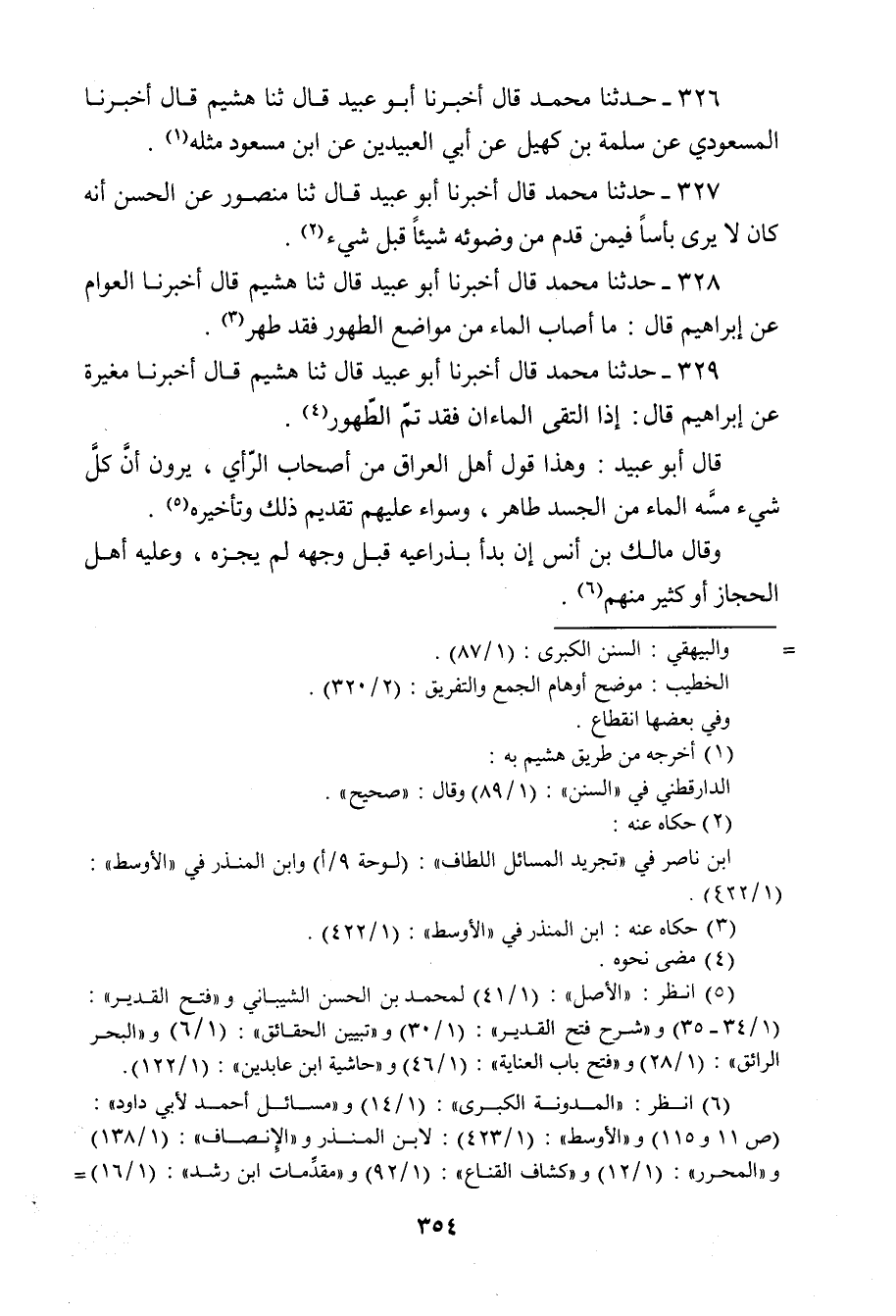 329 - حَدَّثَنَا مُحَمَّدٌ، قَالَ: أَخْبَرَنَا أَبُو عُبَيْدٍ قَالَ: ثنا هُشَيْمٌ، قَالَ: أَخْبَرَنَا مُغِيرَةُ، عَنْ إِبْرَاهِيمَ، قَالَ: «§إِذَا الْتَقَى الْمَاءَانِ فَقَدْ تَمَّ الطَّهُورُ» قَالَ أَبُو عُبَيْدٍ: وَهَذَا قَوْلُ أَهْلِ الْعِرَاقِ مِنْ أَصْحَابِ الرَّأْيِ , يَرَوْنَ أَنَّ كُلَّ شَيْءٍ مَسَّهُ الْمَاءُ مِنَ الْجَسَدِ طَاهِرٌ , وَسَوَاءٌ عَلَيْهِمْ تَقْدِيمُ ذَلِكَ وَتَأْخِيرُهُ. وَقَالَ مَالِكُ بْنُ أَنَسٍ إِنْ بَدَأَ بِذِرَاعَيْهِ قَبْلَ وَجْهِهِ لَمْ يُجِزِهْ , وَعَلَيْهِ أَهْلُ الْحِجَازِ أَوْ كَثِيرٌ مِنْهُمْ، -[355]- قَالَ أَبُو عُبَيْدٍ: وَإِنَّ الَّذِي عِنْدَنَا فِيهِ: الْأَخْذُ بِهَذَا الْقَوْلِ: أَنَّهُ لَا يُجْزِئُهُ , وَيَكُونُ عَلَيْهِ الْإِعَادَةُ , كَمَا اشْتَرَطَهُ اللَّهُ حِينَ بَدَأَ بِالْوُجُوهِ فَقَالَ: {فَاغْسِلُوا وُجُوهَكُمْ} [المائدة: 6] قَالَ: {وَأَيْدِيَكُمْ إِلَى الْمَرَافِقِ} [المائدة: 6] قَالَ أَبُو عُبَيْدٍ: مَنْ ذَهَبَ إِلَى ذَلِكَ الْقَوْلِ فَإِنَّهُ إِنَّمَا هُوَ لِقَوْلِهِ عَزَّ وَجَلَّ: {يَا أَيُّهَا الَّذِينَ آمَنُوا ارْكَعُوا وَاسْجُدُوا} [الحج: 77] فَهَلْ يَجُوزُ أَنْ يُقَدَّمَ السُّجُودُ قَبْلَ الرُّكُوعِ؟ وَكَذَلِكَ قَوْلُهُ عَزَّ وَجَلَّ: {إِنَّ الصَّفَا وَالْمَرْوَةَ مِنْ شَعَائِرِ اللَّهِ} [البقرة: 158] وَأَمَّا حَدِيثُ عَلِيٍّ وَعَبْدِ اللَّهِ: فَإِنَّمَا هُوَ فِي الْأَعْضَاءِ خَاصَّةً , وَهَذَا جَائِزٌ حَسَنٌ , لِأَنَّ التَّنْزِيلَ لَمْ يَأْمُرْهُ بِيَمِينٍ قَبْلَ يَسَارٍ , إِنَّمَا نَزَلَ بِالْجُمْلَةِ فِي ذِكْرِ الْأَيْدِي , وَذِكْرِ الْأَرْجُلِ , فَهَذَا الَّذِي أَبَاحَ الْعُلَمَاءُ تَقْدِيمَ الْمَيَاسِرِ عَلَى الْمَيَامِنِ , وَهُوَ خِلَافُ الْأَمْرِ الْأَوَّلِ