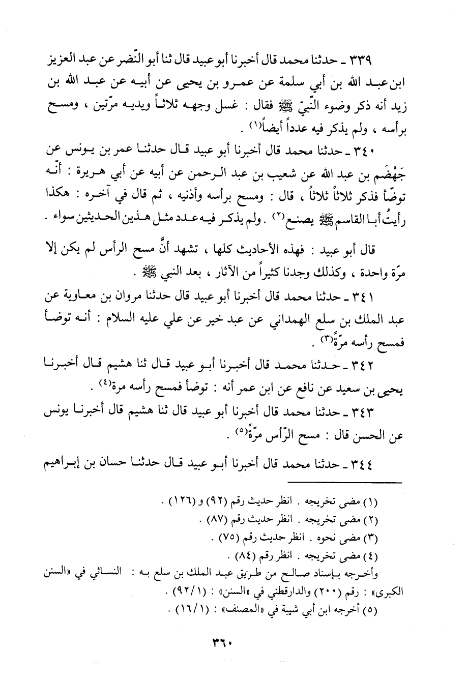 342 - حَدَّثَنَا مُحَمَّدٌ، قَالَ: أَخْبَرَنَا أَبُو عُبَيْدٍ قَالَ: ثنا هُشَيْمٌ، قَالَ: أَخْبَرَنَا يَحْيَى بْنُ سَعِيدٍ، عَنْ نَافِعٍ، عَنِ ابْنِ عُمَرَ، أَنَّهُ: «§تَوَضَّأَ فَمَسَحَ رَأْسَهُ مَرَّةً»