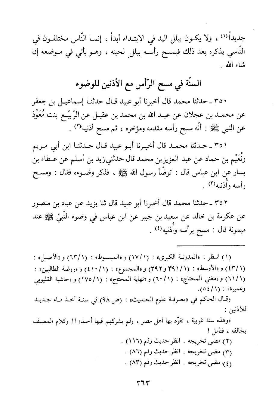 351 - حَدَّثَنَا مُحَمَّدٌ، قَالَ: أَخْبَرَنَا أَبُو عُبَيْدٍ قَالَ: حَدَّثَنَا ابْنُ أَبِي مَرْيَمَ، وَنُعَيْمُ بْنُ حَمَّادٍ، عَنْ عَبْدِ الْعَزِيزِ بْنِ مُحَمَّدٍ، قَالَ: حَدَّثَنِي زَيْدُ بْنُ أَسْلَمَ، عَنْ عَطَاءِ بْنِ يَسَارٍ، عَنِ ابْنِ عَبَّاسٍ، قَالَ: تَوَضَّأَ رَسُولُ اللَّهِ صَلَّى اللَّهُ عَلَيْهِ وَسَلَّمَ فَذَكَرَ وُضُوءَهُ فَقَالَ: «§وَمَسَحَ عَلَى رَأْسِهِ وَأُذُنَيْهِ»