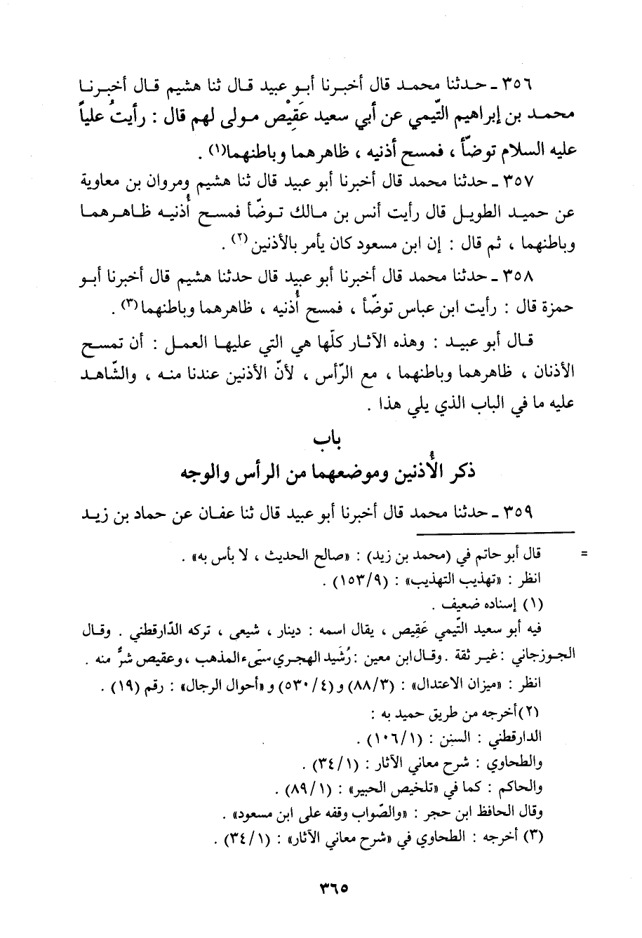356 - حَدَّثَنَا مُحَمَّدٌ، قَالَ: أَخْبَرَنَا أَبُو عُبَيْدٍ قَالَ: ثنا هُشَيْمٌ، قَالَ: أَخْبَرَنَا مُحَمَّدُ بْنُ إِبْرَاهِيمَ التَّيْمِيُّ، , عَنْ أَبِي سَعِيدٍ عَقِيصٍ مَوْلَى لَهُمْ , قَالَ: «رَأَيْتُ عَلِيًّا عَلَيْهِ السَّلَامُ §تَوَضَّأَ , فَمَسَحَ أُذُنَيْهِ , ظَاهِرَهُمَا وَبَاطِنَهُمَا»
