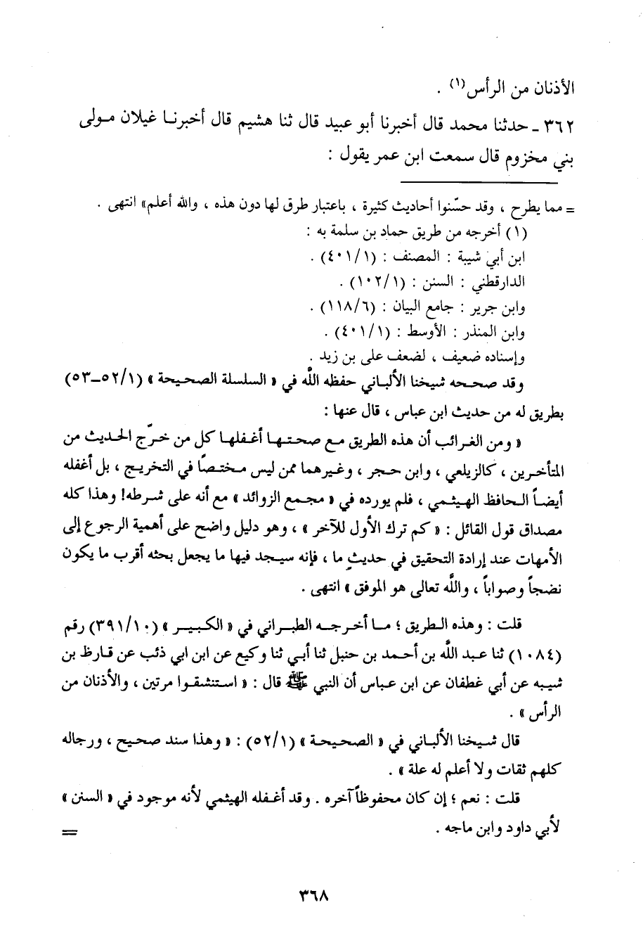 362 - حَدَّثَنَا مُحَمَّدٌ، قَالَ: أَخْبَرَنَا أَبُو عُبَيْدٍ قَالَ: ثنا هُشَيْمٌ، قَالَ: أَخْبَرَنَا غَيْلَانُ، مَوْلَى بَنِي مَخْزُومٍ , قَالَ: سَمِعْتُ ابْنَ عُمَرَ، يَقُولُ: -[371]- «§الْأُذُنَانِ مِنَ الرَّأْسِ» قَالَ أَبُو عُبَيْدٍ: وَفِيهِ قَوْلٌ سِوَاهُ