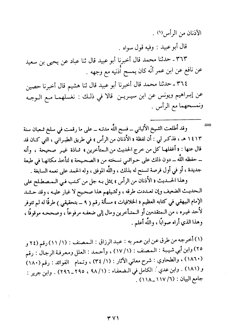 363 - حَدَّثَنَا مُحَمَّدٌ، قَالَ: أَخْبَرَنَا أَبُو عُبَيْدٍ قَالَ: ثنا عَبَّادٌ، عَنْ يَحْيَى بْنِ سَعِيدٍ، عَنْ نَافِعٍ، عَنِ ابْنِ عُمَرَ، أَنَّهُ «§كَانَ يَمْسَحُ أُذُنَيْهِ مَعَ وَجْهِهِ»