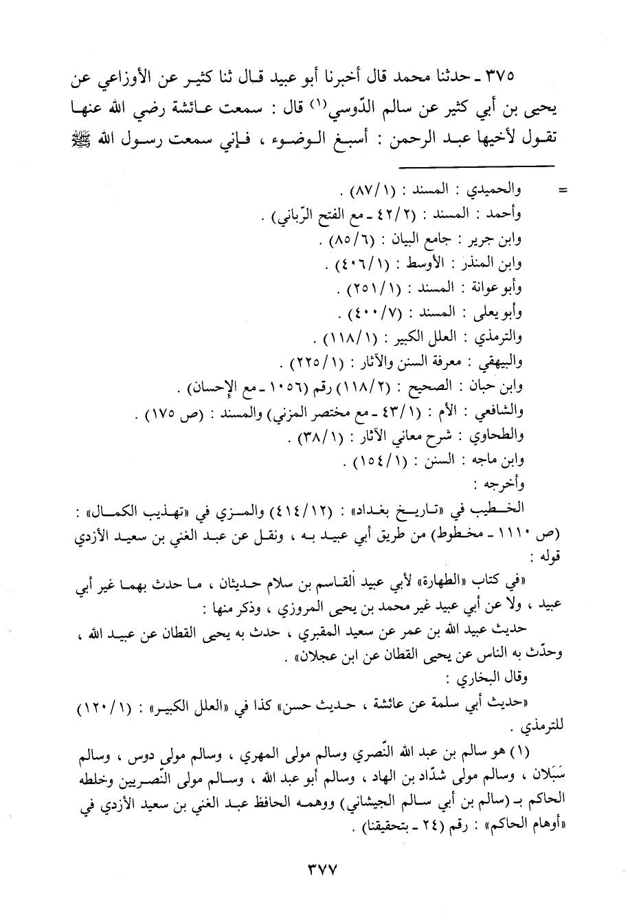 375 - حَدَّثَنَا مُحَمَّدٌ، قَالَ: أَخْبَرَنَا أَبُو عُبَيْدٍ قَالَ: ثنا كَثِيرٌ، عَنِ الْأَوْزَاعِيِّ، عَنْ يَحْيَى بْنِ أَبِي كَثِيرٍ، عَنْ سَالِمٍ الدَّوْسِيِّ، قَالَ: سَمِعْتُ عَائِشَةَ، رَضِيَ اللَّهُ عَنْهَا تَقُولُ لَأَخِيهَا عَبْدِ الرَّحْمَنِ: أَسْبِغِ الْوُضُوءَ , فَإِنِّي سَمِعْتُ رَسُولَ اللَّهِ صَلَّى اللَّهُ عَلَيْهِ وَسَلَّمَ -[378]- يَقُولُ: «§وَيْلٌ لِلْأَعْقَابِ مِنَ النَّارِ» . -[382]-