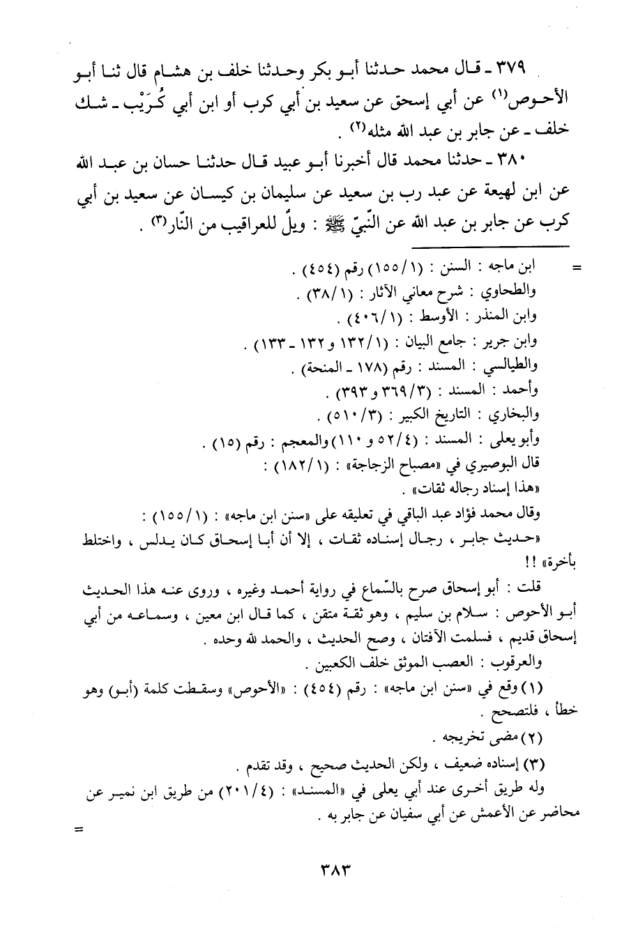 381 - حَدَّثَنَا مُحَمَّدٌ، قَالَ: أَخْبَرَنَا أَبُو عُبَيْدٍ قَالَ: ثنا ابْنُ بُكَيْرٍ، وَعَبْدُ اللَّهِ بْنُ صَالِحٍ، عَنِ اللَّيْثِ بْنِ سَعْدٍ، عَنْ حَيْوَةَ بْنِ شُرَيْحٍ، عَنْ عُقْبَةَ بْنِ مُسْلِمٍ، عَنْ عَبْدِ اللَّهِ بْنِ الْحَارِثِ بْنِ جَزْءٍ، قَالَ: سَمِعْتُ رَسُولَ اللَّهِ صَلَّى اللَّهُ عَلَيْهِ وَسَلَّمَ يَقُولُ: «§وَيْلٌ لِلْأَعْقَابِ , وَبُطُونِ الْأَقْدَامِ مِنَ النَّارِ»