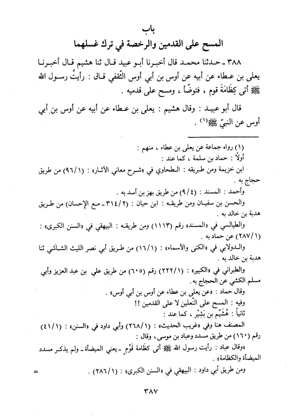 388 - حَدَّثَنَا مُحَمَّدٌ، قَالَ: أَخْبَرَنَا أَبُو عُبَيْدٍ قَالَ: ثنا هُشَيْمٌ، قَالَ: أَخْبَرَنَا يَعْلَى بْنُ عَطَاءٍ، عَنْ أَبِيهِ، عَنْ أَوْسِ بْنِ أَبِي أَوْسٍ الثَّقَفِيِّ، قَالَ: رَأَيْتُ رَسُولَ اللَّهِ صَلَّى اللَّهُ عَلَيْهِ وَسَلَّمَ §أَتَى كِظَامَةَ قَوْمٍ , فَتَوَضَّأَ , وَمَسَحَ عَلَى قَدَمَيْهِ " قَالَ أَبُو عُبَيْدٍ: وَقَالَ هُشَيْمٌ: يَعْلَى بْنُ عَطَاءٍ عَنْ , أَبِيهِ عَنْ أَوْسِ بْنِ أَبِي أَوْسٍ , عَنِ النَّبِيِّ صَلَّى اللَّهُ عَلَيْهِ وَسَلَّمَ