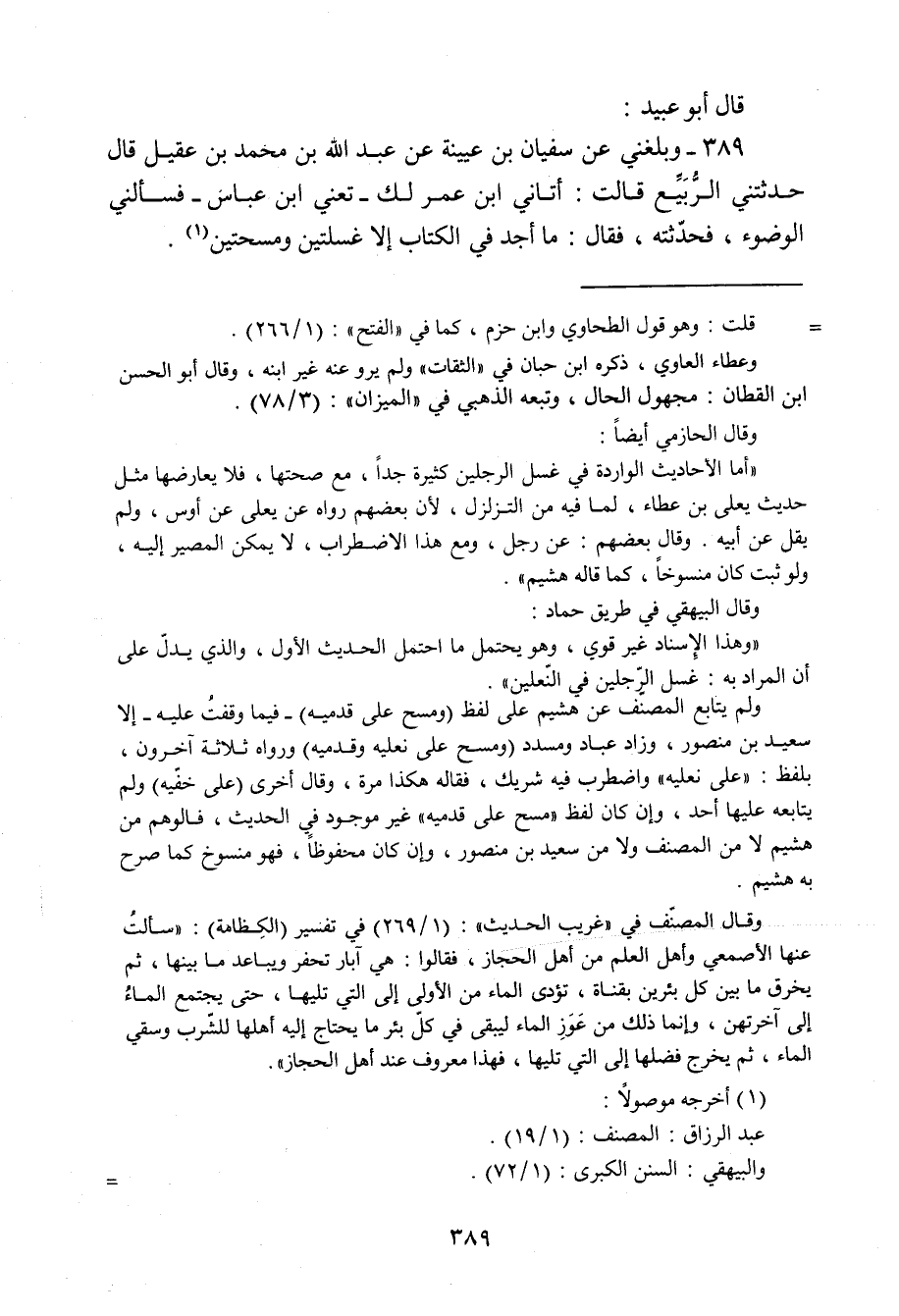 389 - قَالَ أَبُو عُبَيْدٍ وَبَلَغَنِي عَنْ سُفْيَانَ بْنِ عُيَيْنَةَ، عَنْ عَبْدِ اللَّهِ بْنِ مُحَمَّدِ بْنِ عَقِيلٍ، قَالَ: حَدَّثَتْنِي الرُّبَيِّعُ، قَالَتْ: أَتَانِي ابْنُ عَمٍّ لَكَ , تَعْنِي ابْنَ عَبَّاسٍ , فَسَأَلَنِي الْوُضُوءَ , فَحَدَّثْتُهُ , فَقَالَ: «§مَا أَجِدُ فِي الْكِتَابِ إِلَّا غَسْلَتَيْنِ وَمَسْحَتَيْنِ -[390]-» . قَالَ أَبُو عُبَيْدٍ: يَعْنِي أَنَّهُ جَعَلَ فِي الْقَدَمَيْنِ الْمَسْحَ مِثْلَ الرَّأْسِ