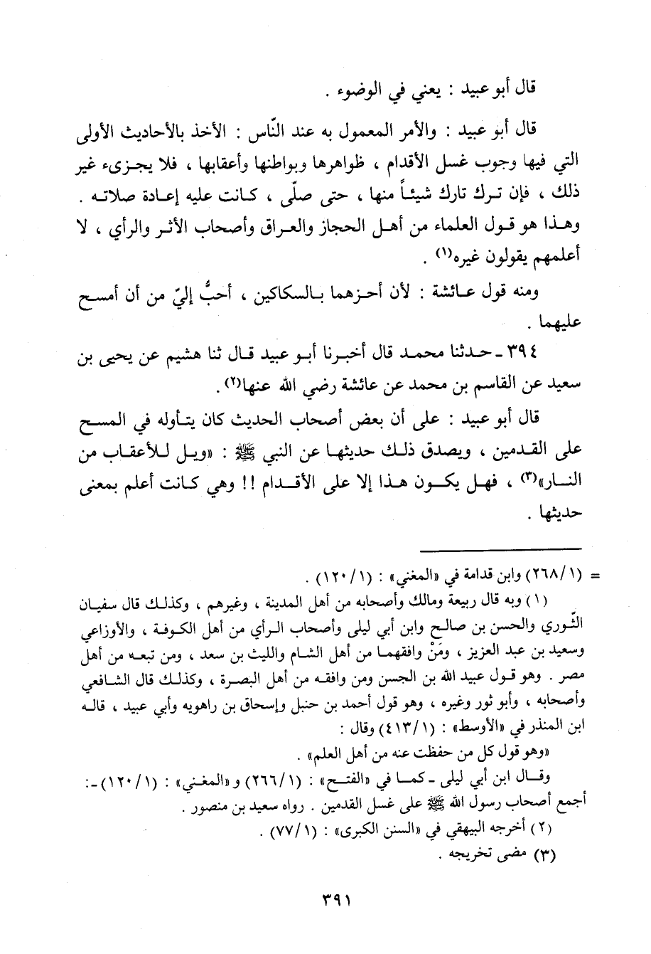 394 - وَمِنْهُ قَوْلُ عَائِشَةَ: «§لَأَنْ أَحُزُّهُمَا بِالسَّكَاكِينِ , أَحَبُّ إِلَيَّ مِنْ أَنْ أَمْسَحَ عَلَيْهِمَا» حَدَّثَنَا مُحَمَّدٌ، قَالَ: أَخْبَرَنَا أَبُو عُبَيْدٍ قَالَ: ثنا هُشَيْمٌ، عَنْ يَحْيَى بْنِ سَعِيدٍ، عَنِ الْقَاسِمِ بْنِ مُحَمَّدٍ، عَنْ عَائِشَةَ، رَضِيَ اللَّهُ عَنْهَا قَالَ أَبُو عُبَيْدٍ: عَلَى أَنَّ بَعْضَ، أَصْحَابِ الْحَدِيثِ كَانَ يَتَأَوَّلُهُ فِي الْمَسْحِ عَلَى الْقَدَمَيْنِ , وَيُصَدِّقُ ذَلِكَ حَدِيثُهَا عَنِ النَّبِيِّ صَلَّى اللَّهُ عَلَيْهِ وَسَلَّمَ: «وَيْلٌ لِلْأَعْقَابِ مِنَ النَّارِ» فَهَلْ يَكُونُ هَذَا إِلَّا عَلَى الْأَقْدَامِ وَهِيَ كَانَتْ أَعْلَمُ بِمَعْنَى حَدِيثِهَا