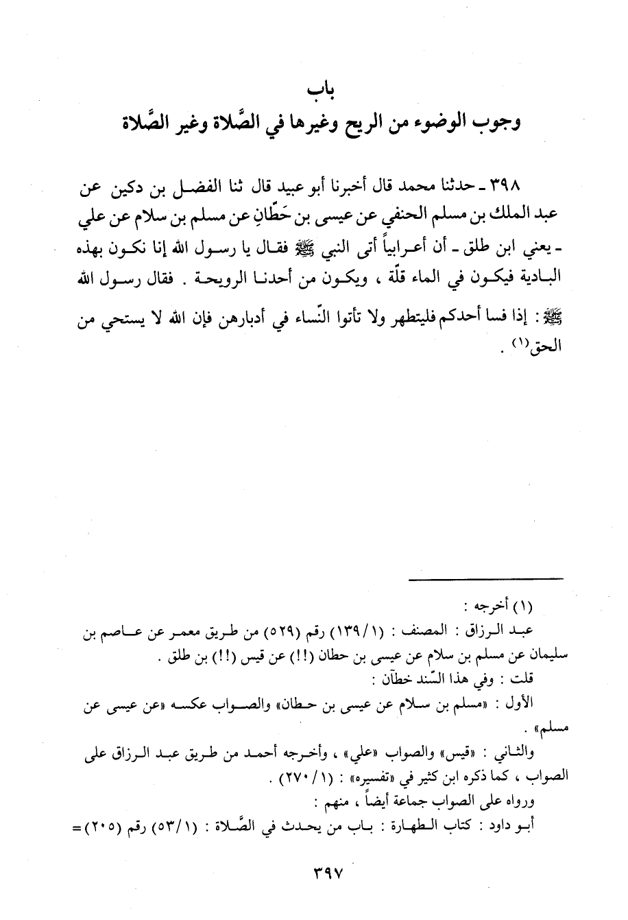 398 - حَدَّثَنَا مُحَمَّدٌ، قَالَ: أَخْبَرَنَا أَبُو عُبَيْدٍ قَالَ: ثنا الْفَضْلُ بْنُ دُكَيْنٍ، عَنْ عَبْدِ الْمَلِكِ بْنِ مُسْلِمٍ الْحَنَفِيِّ، عَنْ عِيسَى بْنِ حِطَّانَ، عَنْ مُسْلِمِ بْنِ سَلَّامٍ، عَنْ عَلِيٍّ، يَعْنِي ابْنَ طَلْقٍ، أَنَّ أَعْرَابِيًّا، أَتَى النَّبِيَّ صَلَّى اللَّهُ عَلَيْهِ وَسَلَّمَ فَقَالَ: يَا رَسُولَ اللَّهِ إِنَّا نَكُونُ بِهَذِهِ الْبَادِيَةِ فَيَكُونُ فِي الْمَاءِ قِلَّةٌ , وَيَكُونُ مِنْ أَحَدِنَا الرُّوَيْحَةُ , فَقَالَ رَسُولُ اللَّهِ صَلَّى اللَّهُ عَلَيْهِ وَسَلَّمَ: «§إِذَا فَسَا أَحَدُكُمْ فَلْيَتَطَهَّرْ وَلَا تَأْتُوا النِّسَاءَ فِي أَدْبَارِهِنَّ فَإِنَّ اللَّهَ لَا يَسْتَحِي مِنَ الْحَقِّ»