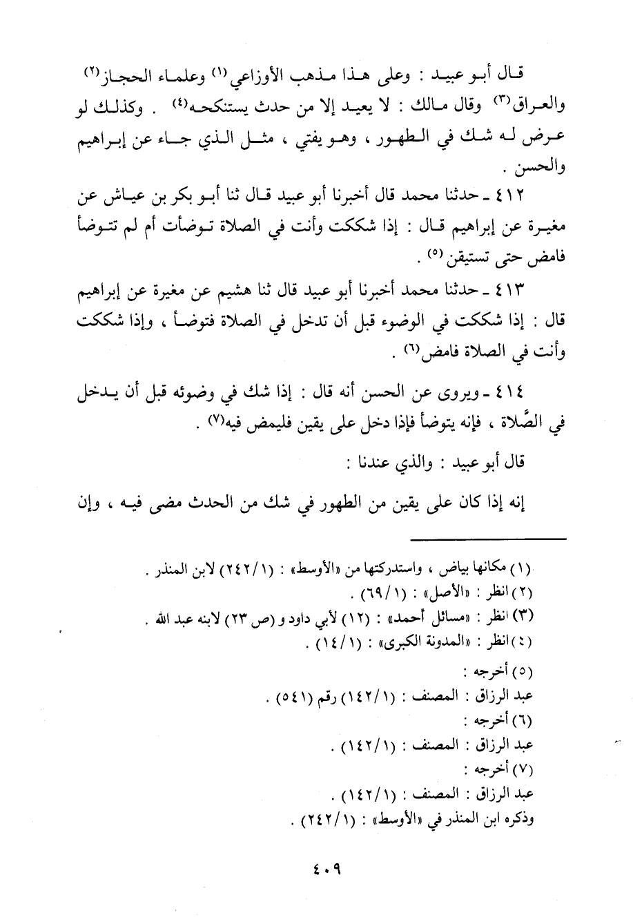 411 - حَدَّثَنَا مُحَمَّدٌ، قَالَ: أَخْبَرَنَا أَبُو عُبَيْدٍ قَالَ: حَدَّثَنَا مُحَمَّدُ بْنُ رَبِيعَةَ، عَنِ الْجَعْدِ، قَالَ سَمِعْتُ عِكْرِمَةَ، يَقُولُ: قَالَ ابْنُ عَبَّاسٍ: «§لَا يَنْصَرِفْ حَتَّى يَسْمَعَ صَوْتًا بِأُذُنِهِ أَوْ يَجِدَ رِيحًا بِأَنْفِهِ» قَالَ أَبُو عُبَيْدٍ: وَعَلَى هَذَا مَذْهَبُ الْأَوْزَاعِيِّ , وَعُلَمَاءُ الْحِجَازِ وَالْعِرَاقِ وَقَالَ مَالِكٌ: لَا يُعِيدُ إِلَّا مِنْ حَدَثٍ يَسْتَنْكِحُهُ. وَكَذَلِكَ لَوْ عَرَضَ لَهُ شَكٌّ فِي الطَّهُورِ , وَهُوَ يُفْتِي , مِثْلَ الَّذِي جَاءَ عَنْ إِبْرَاهِيمَ وَالْحَسَنِ