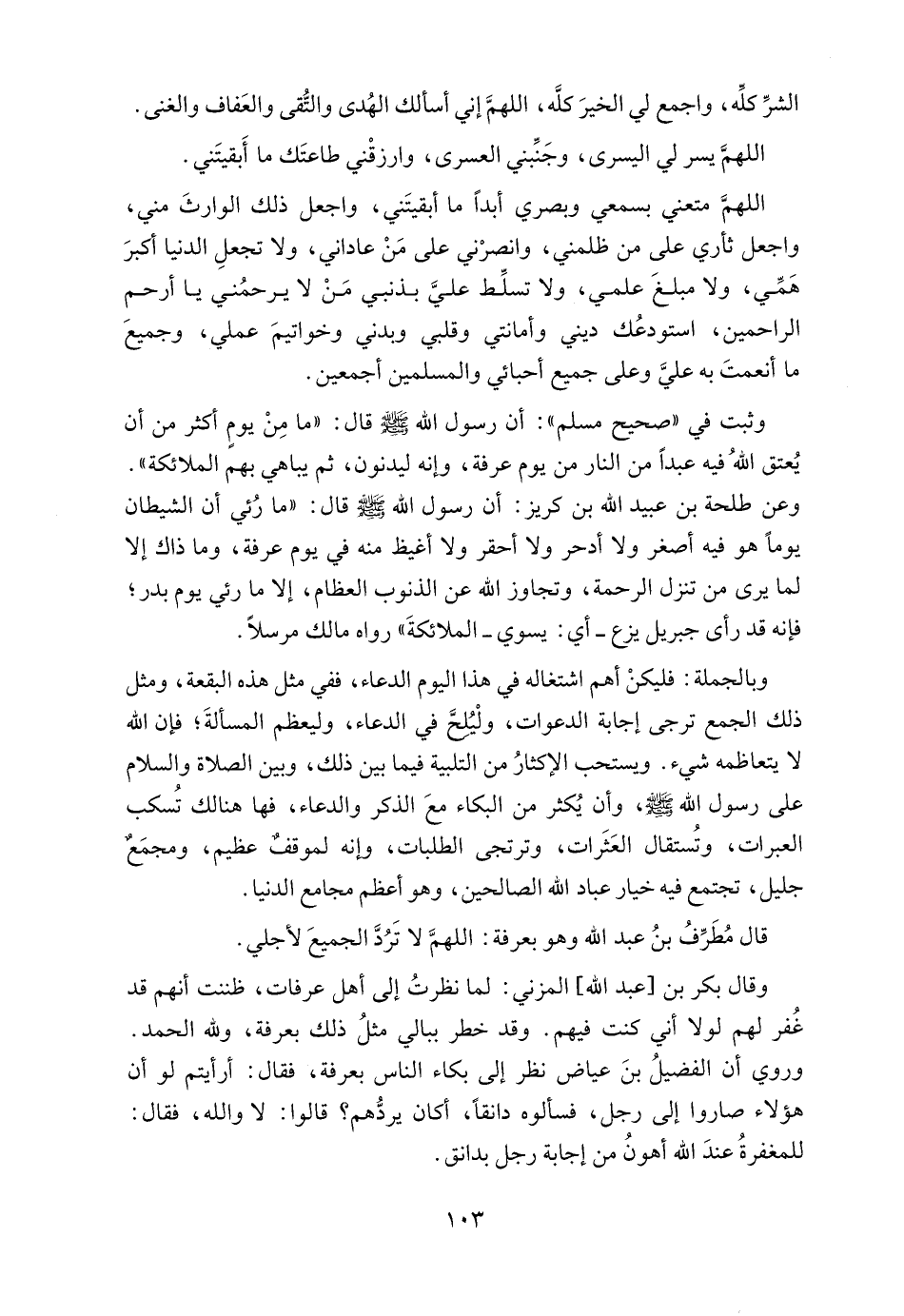 قال مُطَرِّفُ بنُ عبد الله وهو بعرفة: اللهمَّ لا تَرُدَّ الجميعَ لأجلي.