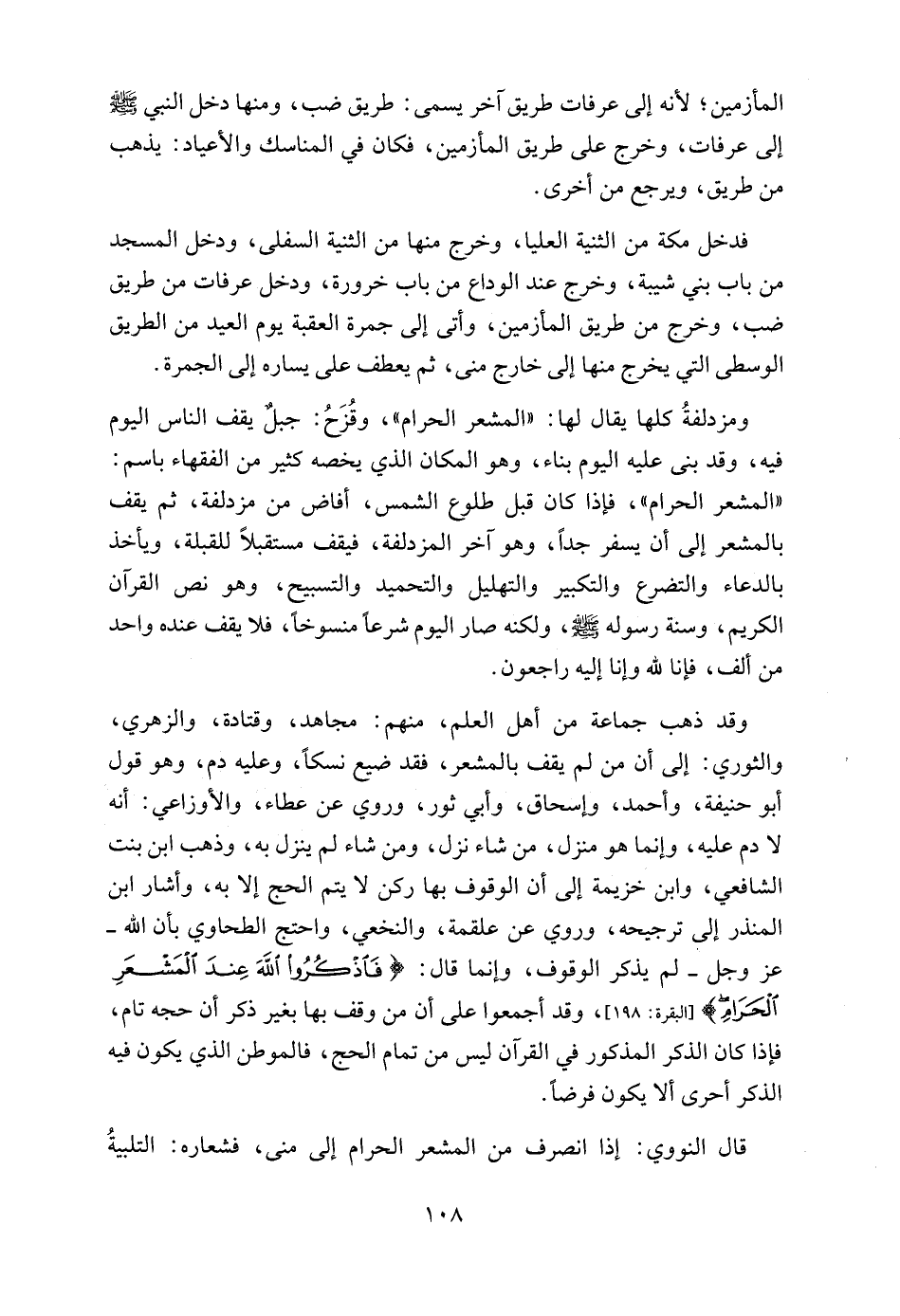 ومزدلفةُ كلها يقال لها: "المشعر الحرام"، وقُزَحُ: جبلٌ يقف الناس اليوم فيه، وقد بنى عليه اليوم بناء، وهو المكان الذي يخصه كثير من الفقهاء باسم: "المشعر الحرام"، فإذا كان قبل طلوع الشمس، أفاض من مزدلفة، ثم يقف بالمشعر إلى أن يسفر جداً، وهو آخر المزدلفة، فيقف مستقبلاً للقبلة، ويأخذ بالدعاء والتضرع والتكبير والتهليل والتحميد والتسبيح، وهو نص القرآن الكريم، وسنة رسوله - صلى الله عليه وسلم -، ولكنه صار اليوم شرعاً منسوخاً، فلا يقف عنده واحد من ألف، فإنا لله وإنا إليه راجعون.