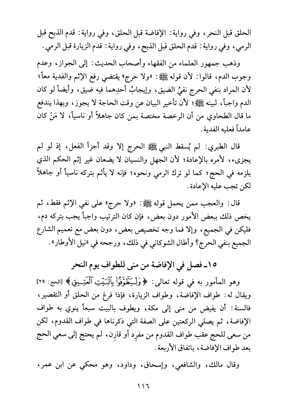 قال: والعجب ممن يحمل قوله - صلى الله عليه وسلم -: "ولا حرج" على نفي الإثم فقط، ثم يخص ذلك ببعض الأمور دون بعض، فإن كان الترتيب واجباً يجب بتركه دم، فليكن في الجميع، وإلا فما وجه تخصيص بعض، دون بعض مع تعميم الشارع الجميع بنفي الحرج؟ وأطال الشوكاني في ذلك، ورجحه في "نيل الأوطار".