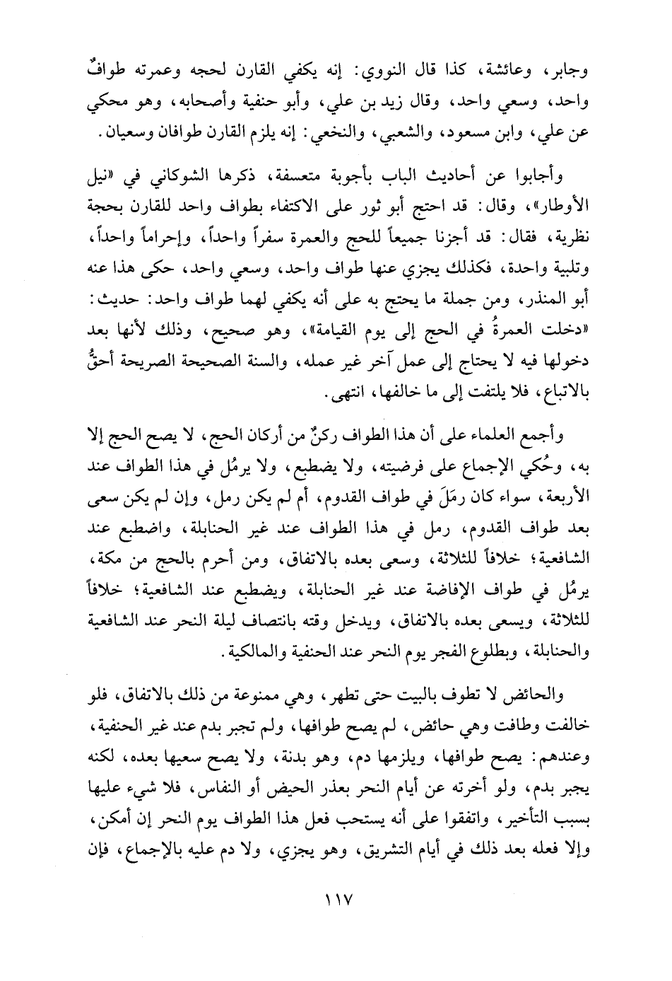 وأجابوا عن أحاديث الباب بأجوبة متعسفة، ذكرها الشوكاني في "نيل الأوطار"، وقال: قد احتج أبو ثور على الاكتفاء بطواف واحد للقارن بحجة نظرية، فقال: قد أجزنا جميعاً للحج والعمرة سفراً واحداً، وإحراماً واحداً، وتلبية واحدة، فكذلك يجزي عنها طواف واحد، وسعي واحد، حكى هذا عنه أَبو المنذر، ومن جملة ما يحتج به على أنه يكفي لهما طواف واحد: حديث: "دخلت العمرةُ في الحج إلى يوم القيامة"، وهو صحيح، وذلك لأنها بعد دخولها فيه لا يحتاج إلى عمل آخر غير عمله، والسنة الصحيحة الصريحة أحقُّ بالاتباع، فلا يلتفت إلى ما خالفها، انتهى.