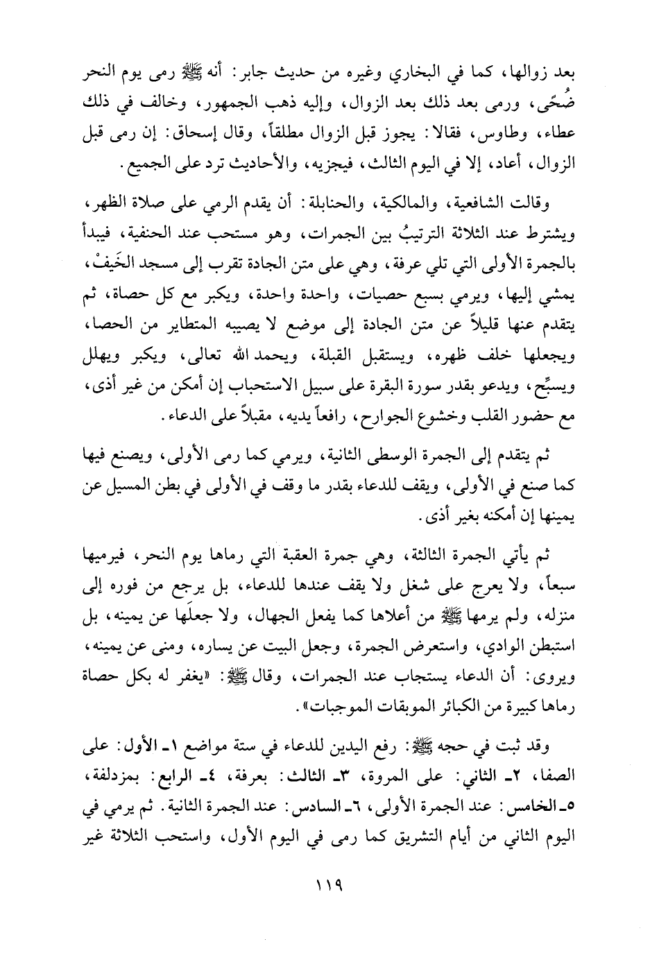 ثم يأتي الجمرة الثالثة، وهي جمرة العقبة التي رماها يوم النحر، فيرميها سبعاً، ولا يعرج على شغل ولا يقف عندها للدعاء، بل يرجع من فوره إلى منزله، ولم يرمها - صلى الله عليه وسلم - من أعلاها كما يفعل الجهال، ولا جعلَها عن يمينه، بل استبطن الوادي، واستعرض الجمرة، وجعل البيت عن يساره، ومنى عن يمينه، ويروى: أن الدعاء يستجاب عند الجمرات، وقال - صلى الله عليه وسلم -: "يغفر له بكل حصاة رماها كبيرة من الكبائر الموبقات الموجبات".
