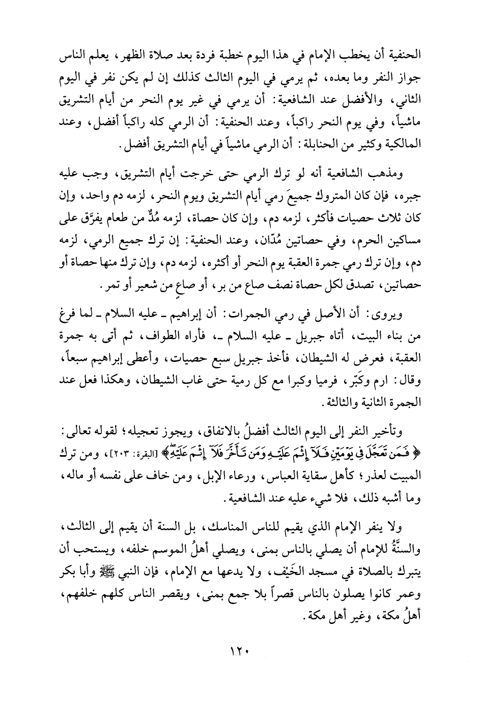 ولا ينفر الإمام الذي يقيم للناس المناسك، بل السنة أن يقيم إلى الثالث، والسنَّةُ للإمام أن يصلي بالناس بمنى، ويصلي أهلُ الموسم خلفه، ويستحب أن يتبرك بالصلاة في مسجد الخَيْف، ولا يدعها مع الإمام، فإن النبي - صلى الله عليه وسلم - وأبا بكر وعمر كانوا يصلون بالناس قصراً بلا جمع بمنى، ويقصر الناس كلهم خلفهم، أهلُ مكة، وغير أهل مكة.