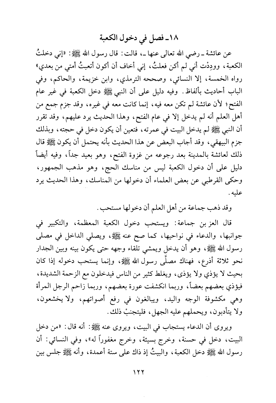 عن عائشة -رضي الله تعالى عنها-، قالت: قال رسول الله - صلى الله عليه وسلم -: "إني دخلتُ الكعبة، وودِدْت أني لم أكن فعلتُ، إني أخاف أن أكون أتعبتُ أمتي من بعدي" رواه الخمسة، إلا النسائي، وصححه الترمذي، وابن خزيمة، والحاكم، وفي الباب أحاديث بألفاظ. وفيه دليل على أن النبي - صلى الله عليه وسلم - دخل الكعبة في غير عام الفتح؛ لأن عائشة لم تكن معه فيه، إنما كانت معه في غيره، وقد جزم جمع من أهل العلم أنه لم يدخل إلا في عام الفتح، وهذا الحديث يرد عليهم، وقد تقرر أن النبي - صلى الله عليه وسلم - لم يدخل البيت في عمرته، فتعين أن يكون دخل في حجته، وبذلك جزم البيهقي، وقد أجاب البعض عن هذا الحديث بأنه يحتمل أن يكون - صلى الله عليه وسلم - قال ذلك لعائشة بالمدينة بعد رجوعه من غزوة الفتح، وهو بعيد جداً، وفيه أيضاً دليل على أن دخول الكعبة ليس من مناسك الحج، وهو مذهب الجمهور، وحكى القرطبي عن بعض العلماء أن دخولها من المناسك، وهذا الحديث يرد عليه.
