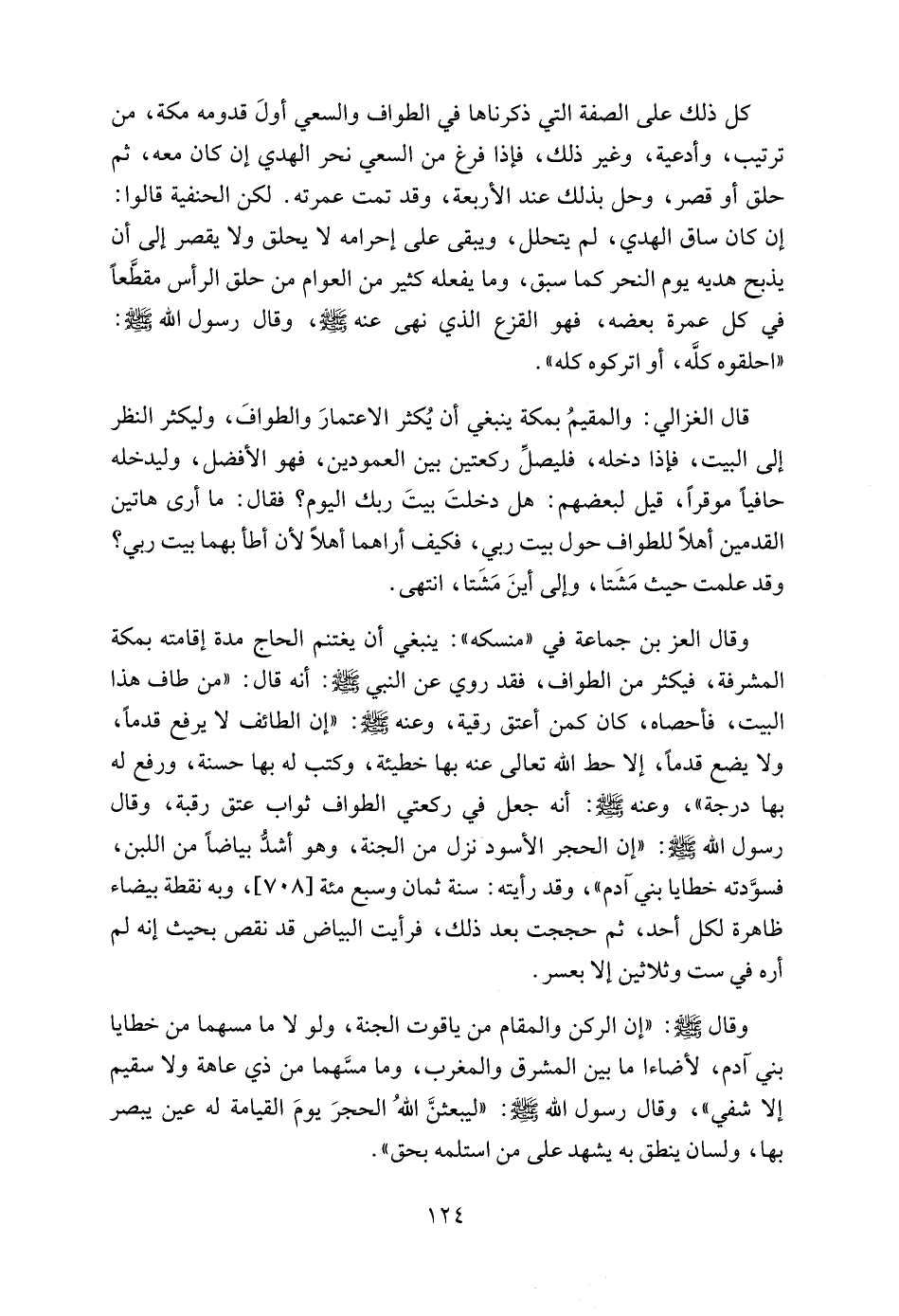 وقال العز بن جماعة في "منسكه": ينبغي أن يغتنم الحاج مدة إقامته بمكة المشرفة، فيكثر من الطواف، فقد روي عن النبي - صلى الله عليه وسلم -: أنه قال: "من طاف هذا البيت، فأحصاه، كان كمن أعتق رقبة، وعنه - صلى الله عليه وسلم -: "إن الطائف لا يرفع قدماً، ولا يضع قدماً، إلا حط الله تعالى عنه بها خطيئة، وكتب له بها حسنة، ورفع له بها درجة"، وعنه - صلى الله عليه وسلم -: أنه جعل في ركعتي الطواف ثواب عتق رقبة، وقال رسول الله - صلى الله عليه وسلم -: "إن الحجر الأسود نزل من الجنة، وهو أشدُّ بياضاً من اللبن، فسوَّدته خطايا بني آدم"، وقد رأيته: سنة ثمان وسبع مئة [708]، وبه نقطة بيضاء ظاهرة لكل أحد، ثم حججت بعد ذلك، فرأيت البياض قد نقص بحيث إنه لم أره في ست وثلاثين إلا بعسر.