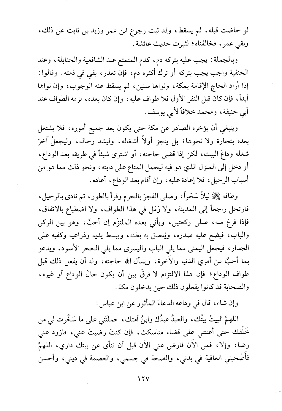 وبالجملة: يجب عليه بتركه دم، كدم المتمتع عند الشافعية والحنابلة، وعند الحنفية واجب يجب بتركه أو ترك أكثره دم، فإن تعذر، بقي في ذمته. وقالوا: إذا أراد الحاج الإقامة بمكة، ونواها سنين، لم يسقط عنه الوجوب، وإن نواها أبداً، فإن كان قبل النفر الأول فلا طواف عليه، وإن كان بعده، لزمه الطواف عند أبي حنيفة، ومحمد خلافاً لأبي يوسف.