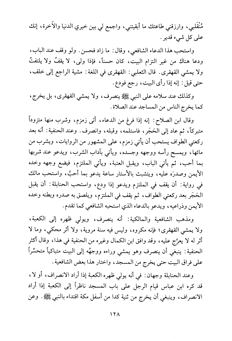 واستحب هذا الدعاء الشافعي، وقال: ما زاد فحسن. ولو وقف عند الباب، ودعا هناك من غير التزام البيت، كان حسناً، فإذا ولى، لا يقفُ ولا يلتفتُ ولا يمشي القهقرى. قال الثعلبي: القهقرى في اللغة: مشية الراجع إلى خلف، حتى قيل: إنه إذا رأى البيت، رجع فودع.