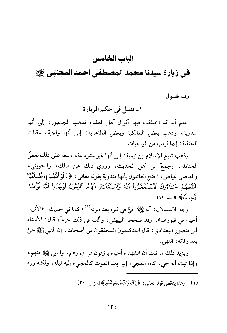 وذهب شيخ الإسلام ابن تيمية: إلى أنها غير مشروعة، وتبعه على ذلك بعضُ الحنابلة، وجمعٌ من أهل الحديث، وروي ذلك عن مالك، والجويني، والقاضي عياض، احتج القائلون بأنها مندوبة بقوله تعالى: {وَلَوْ أَنَّهُمْ إِذْ ظَلَمُوا أَنْفُسَهُمْ جَاءُوكَ فَاسْتَغْفَرُوا اللَّهَ وَاسْتَغْفَرَ لَهُمُ الرَّسُولُ لَوَجَدُوا اللَّهَ تَوَّابًا رَحِيمًا} [النساء: 64].