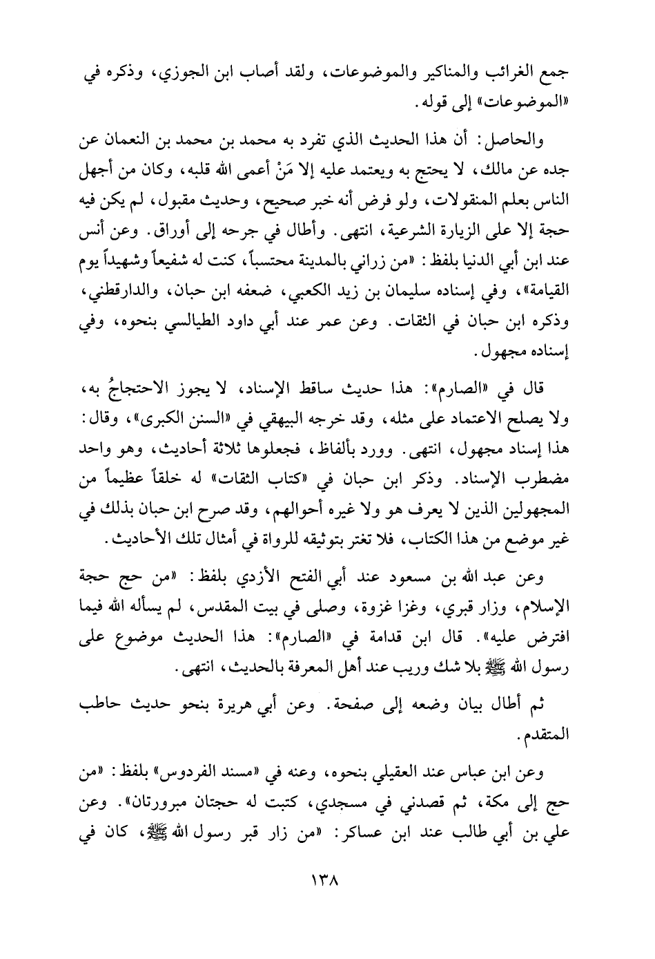 والحاصل: أن هذا الحديث الذي تفرد به محمد بن محمد بن النعمان عن جده عن مالك، لا يحتج به ويعتمد عليه إلا مَنْ أعمى الله قلبه، وكان من أجهل الناس بعلم المنقولات، ولو فرض أنه خبر صحيح، وحديث مقبول، لم يكن فيه حجة إلا على الزيارة الشرعية، انتهى. وأطال في جرحه إلى أوراق. وعن أنس عند ابن أبي الدنيا بلفظ: "من زراني بالمدينة محتسباً، كنت له شفيعاً وشهيداً يوم القيامة"، وفي إسناده سليمان بن زيد الكعبي، ضعفه ابن حبان، والدارقطني، وذكره ابن حبان في الثقات. وعن عمر عند أبي داود الطيالسي بنحوه، وفي إسناده مجهول.