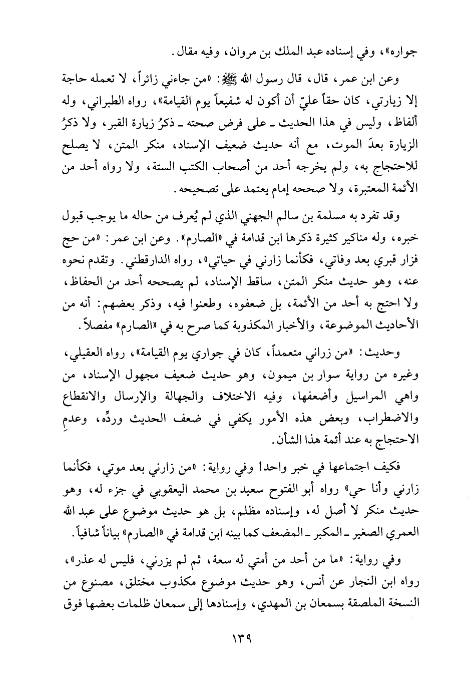 وقد تفرد به مسلمة بن سالم الجهني الذي لم يُعرف من حاله ما يوجب قبول خبره، وله مناكير كثيرة ذكرها ابن قدامة في "الصارم". وعن ابن عمر: "من حج فزار قبري بعد وفاتي، فكأنما زارني في حياتي"، رواه الدارقطني. وتقدم نحوه عنه، وهو حديث منكر المتن، ساقط الإسناد، لم يصححه أحد من الحفاظ، ولا احتج به أحد من الأئمة، بل ضعفوه، وطعنوا فيه، وذكر بعضهم: أنه من الأحاديث الموضوعة، والأخبار المكذوبة كما صرح به في "الصارم" مفصلاً.