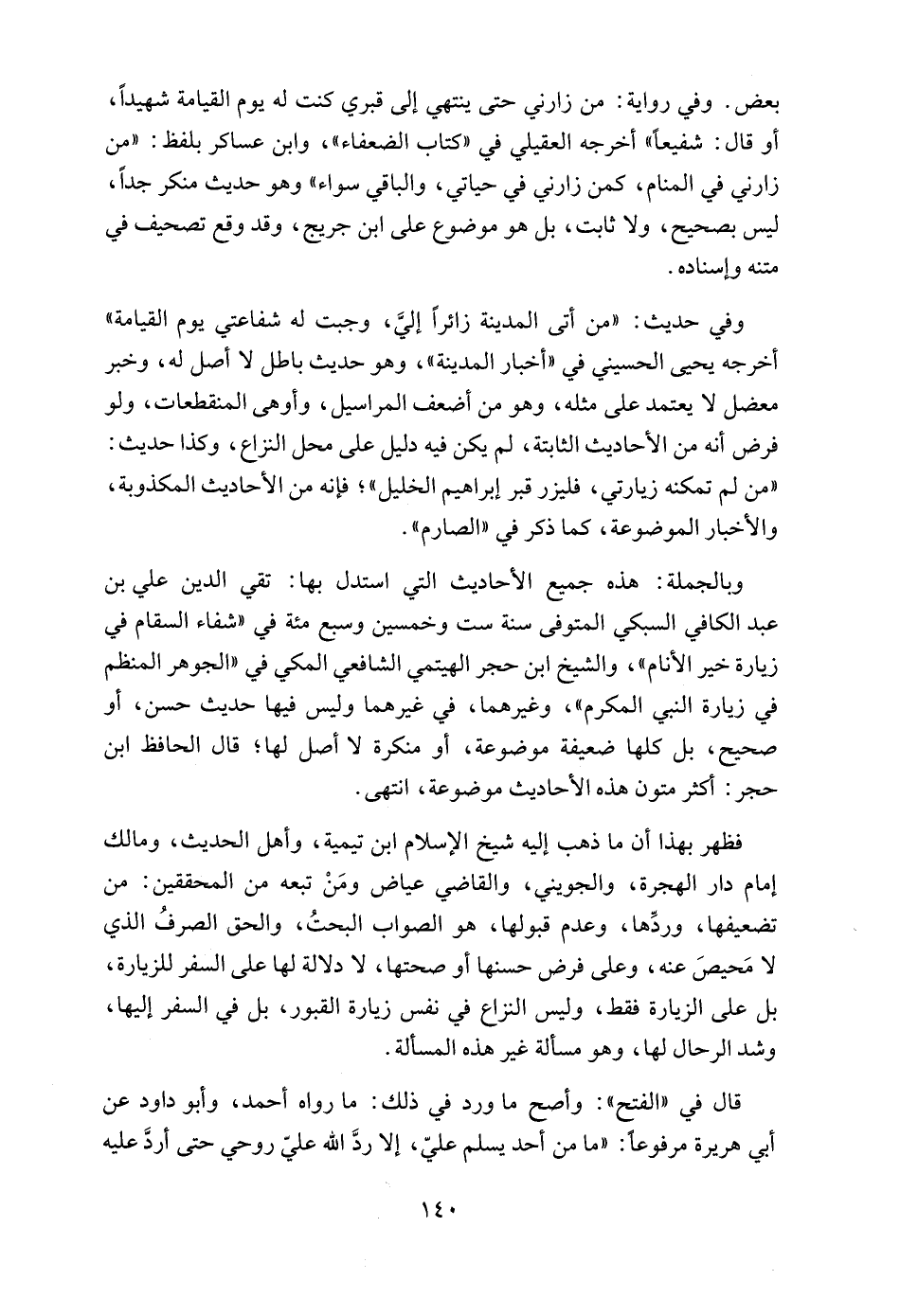 فظهر بهذا أن ما ذهب إليه شيخ الإسلام ابن تيمية، وأهل الحديث، ومالك إمام دار الهجرة، والجويني، والقاضي عياض ومَنْ تبعه من المحققين: من تضعيفها، وردِّها، وعدم قبولها، هو الصواب البحتُ، والحق الصرفُ الذي لا مَحيصَ عنه، وعلى فرض حسنها أو صحتها، لا دلالة لها على السفر للزيارة، بل على الزيارة فقط، وليس النزاع في نفس زيارة القبور، بل في السفر إليها، وشد الرحال لها، وهو مسألة غير هذه المسألة.