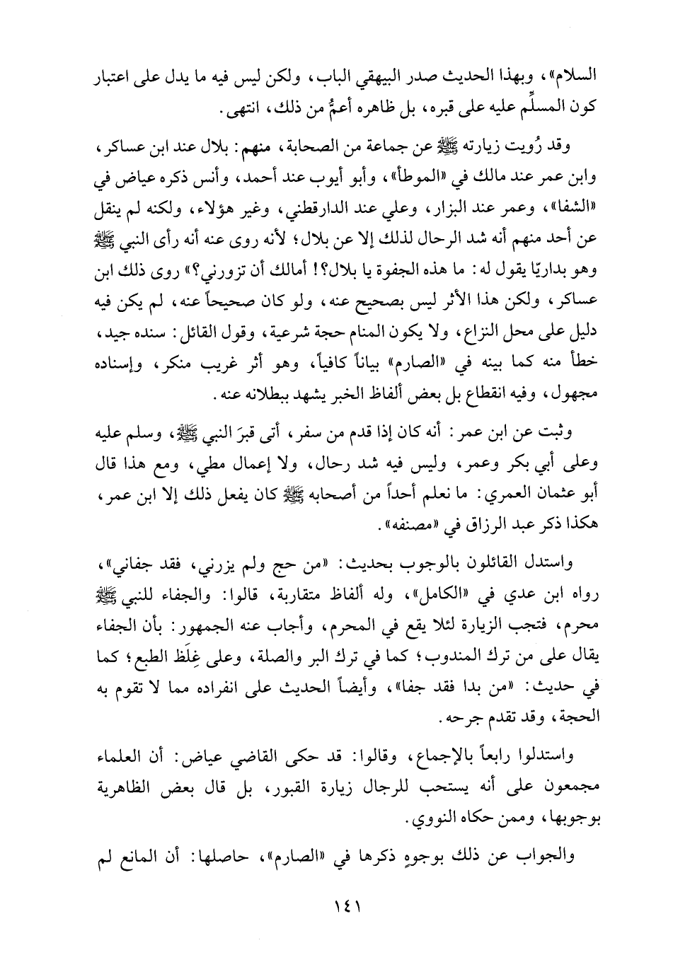 وقد رُويت زيارته - صلى الله عليه وسلم - عن جماعة من الصحابة، منهم: بلال عند ابن عساكر، وابن عمر عند مالك في "الموطأ"، وأبو أيوب عند أحمد، وأنس ذكره عياض في "الشفا"، وعمر عند البزار، وعلي عند الدارقطني، وغير هؤلاء، ولكنه لم ينقل عن أحد منهم أنه شد الرحال لذلك إلا عن بلال؛ لأنه روى عنه أنه رأى النبي - صلى الله عليه وسلم - وهو بداريّا يقول له: ما هذه الجفوة يا بلال؟! أمالك أن تزورني؟ " روى ذلك ابن عساكر، ولكن هذا الأثر ليس بصحيح عنه، ولو كان صحيحاً عنه، لم يكن فيه دليل على محل النزاع، ولا يكون المنام حجة شرعية، وقول القائل: سنده جيد، خطأ منه كما بينه في "الصارم" بياناً كافياً، وهو أثر غريب منكر، وإسناده مجهول، وفيه انقطاع بل بعض ألفاظ الخبر يشهد ببطلانه عنه.