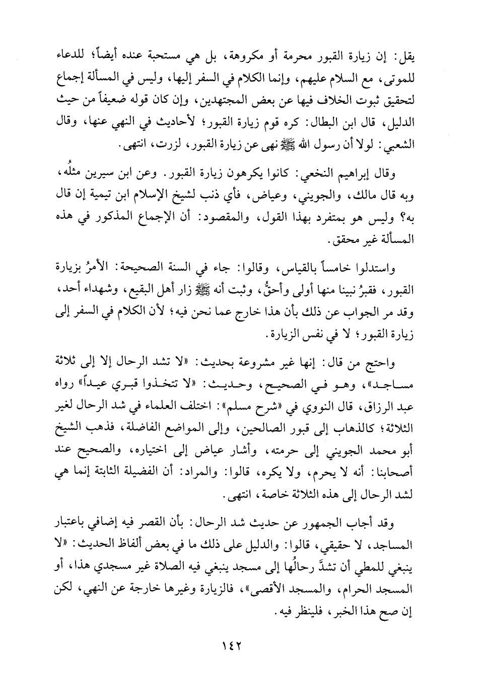 وقال إبراهيم النخعي: كانوا يكرهون زيارة القبور. وعن ابن سيرين مثلُه، وبه قال مالك، والجويني، وعياض، فأي ذنب لشيخ الإسلام ابن تيمية إن قال به؟ وليس هو بمتفرد بهذا القول، والمقصود: أن الإجماع المذكور في هذه المسألة غير محقق.