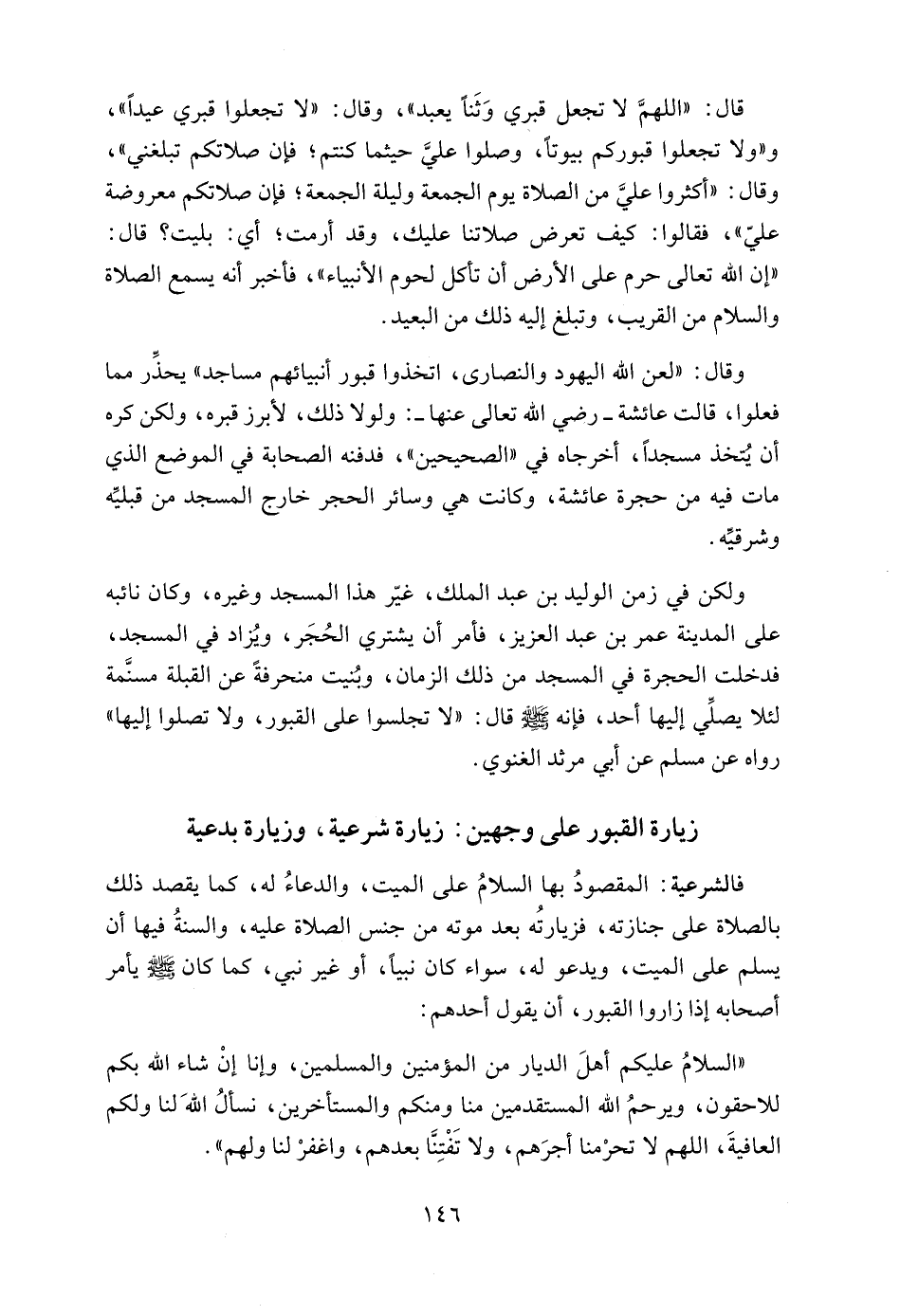 قال: "اللهمَّ لا تجعل قبري وَثَناً يعبد"، وقال: "لا تجعلوا قبري عيداً"، و"ولا تجعلوا قبوركم بيوتاً، وصلوا عليَّ حيثما كنتم؛ فإن صلاتكم تبلغني"، وقال: "أكثروا عليَّ من الصلاة يوم الجمعة وليلة الجمعة؛ فإن صلاتكم معروضة عليّ"، فقالوا: كيف تعرض صلاتنا عليك، وقد أرمت؛ أي: بليت؟ قال: "إن الله تعالى حرم على الأرض أن تأكل لحوم الأنبياء"، فأخبر أنه يسمع الصلاة والسلام من القريب، وتبلغ إليه ذلك من البعيد.