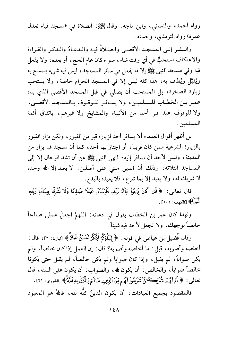 رواه أحمد، والنسائي، وابن ماجه. وقال - صلى الله عليه وسلم -: الصلاة في "مسجد قباء تعدل عمرة" رواه الترمذي، وحسنه.