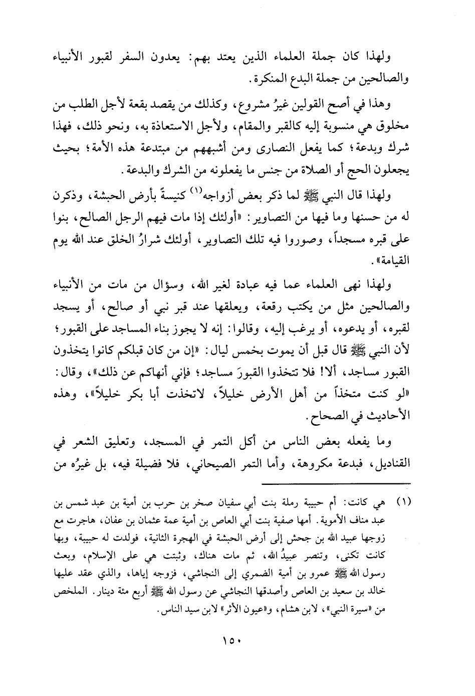 ولهذا كان جملة العلماء الذين يعتد بهم: يعدون السفر لقبور الأنبياء والصالحين من جملة البدع المنكرة.