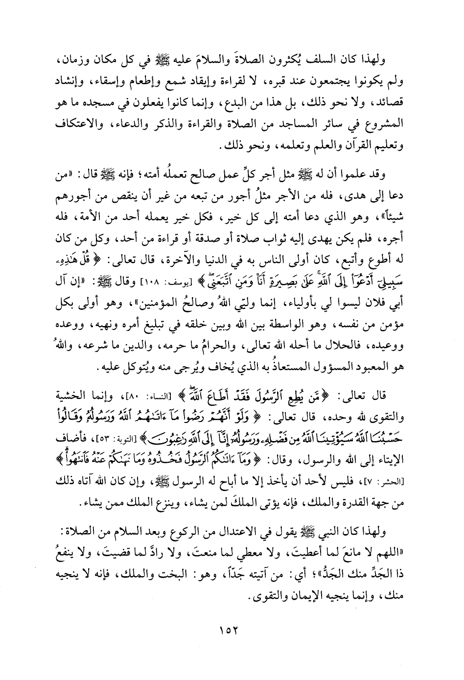ولهذا كان السلف يُكثرون الصلاةَ والسلامَ عليه - صلى الله عليه وسلم - في كل مكان وزمان، ولم يكونوا يجتمعون عند قبره، لا لقراءة وإيقاد شمع وإطعام وإسقاء، وإنشاد قصائد، ولا نحو ذلك، بل هذا من البدع، وإنما كانوا يفعلون في مسجده ما هو المشروع في سائر المساجد من الصلاة والقراءة والذكر والدعاء، والاعتكاف وتعليم القرآن والعلم وتعلمه، ونحو ذلك.