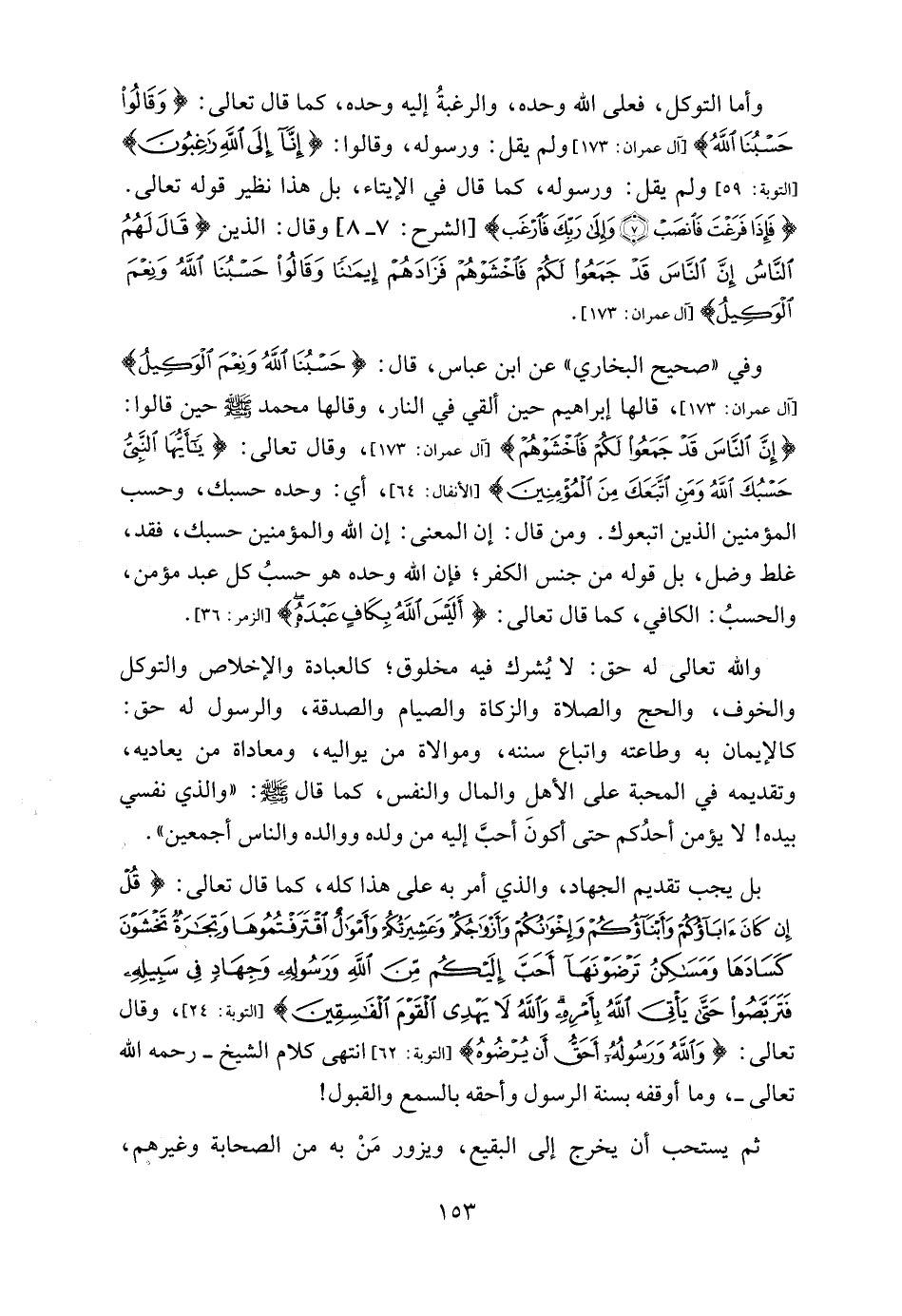 بل يجب تقديم الجهاد، والذي أمر به على هذا كله، كما قال تعالى: {قُلْ إِنْ كَانَ آبَاؤُكُمْ وَأَبْنَاؤُكُمْ وَإِخْوَانُكُمْ وَأَزْوَاجُكُمْ وَعَشِيرَتُكُمْ وَأَمْوَالٌ اقْتَرَفْتُمُوهَا وَتِجَارَةٌ تَخْشَوْنَ كَسَادَهَا وَمَسَاكِنُ تَرْضَوْنَهَا أَحَبَّ إِلَيْكُمْ مِنَ اللَّهِ وَرَسُولِهِ وَجِهَادٍ فِي سَبِيلِهِ فَتَرَبَّصُوا حَتَّى يَأْتِيَ اللَّهُ بِأَمْرِهِ وَاللَّهُ لَا يَهْدِي الْقَوْمَ الْفَاسِقِينَ} [التوبة: 24]، وقال تعالى: {وَاللَّهُ وَرَسُولُهُ أَحَقُّ أَنْ يُرْضُوهُ} [التوبة: 62] انتهى كلام الشيخ -رحمه الله تعالى-، وما أوقفه بسنة الرسول وأحقه بالسمع والقبول!
