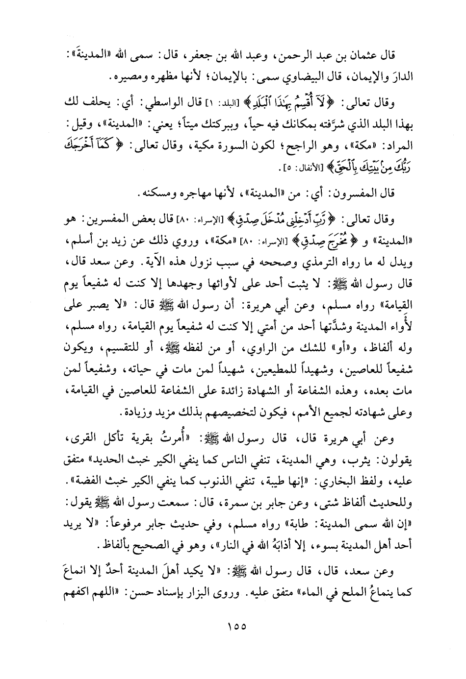 وعن أبي هريرة قال، قال رسول الله - صلى الله عليه وسلم -: "أُمرتُ بقرية تأكل القرى، يقولون: يثرب، وهي المدينة، تنفي الناس كما ينفي الكير خبث الحديد" متفق عليه، ولفظ البخاري: "إنها طيبة، تنفي الذنوب كما ينفي الكير خبث الفضة". وللحديث ألفاظ شتى، وعن جابر بن سمرة، قال: سمعت رسول الله - صلى الله عليه وسلم - يقول: "إن الله سمى المدينة: طابة" رواه مسلم، وفي حديث جابر مرفوعاً: "لا يريد أحد أهل المدينة بسوء، إلا أذابَهُ الله في النار"، وهو في الصحيح بألفاظ.